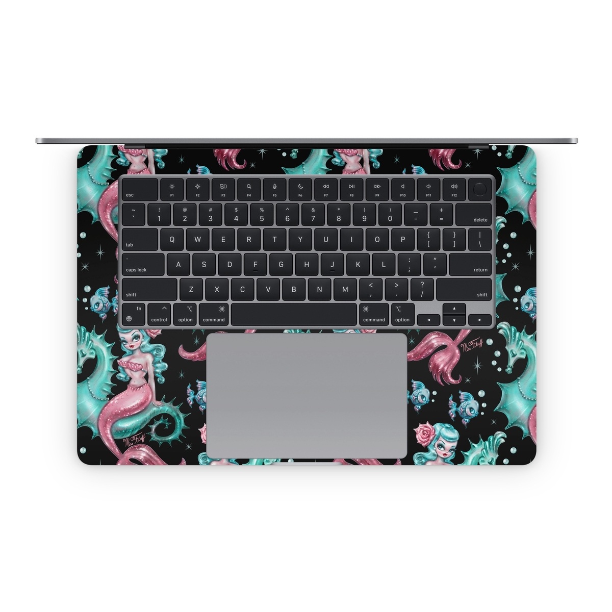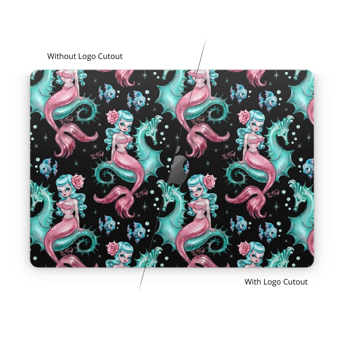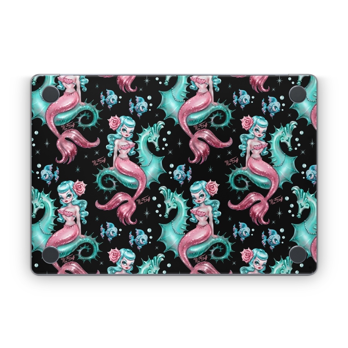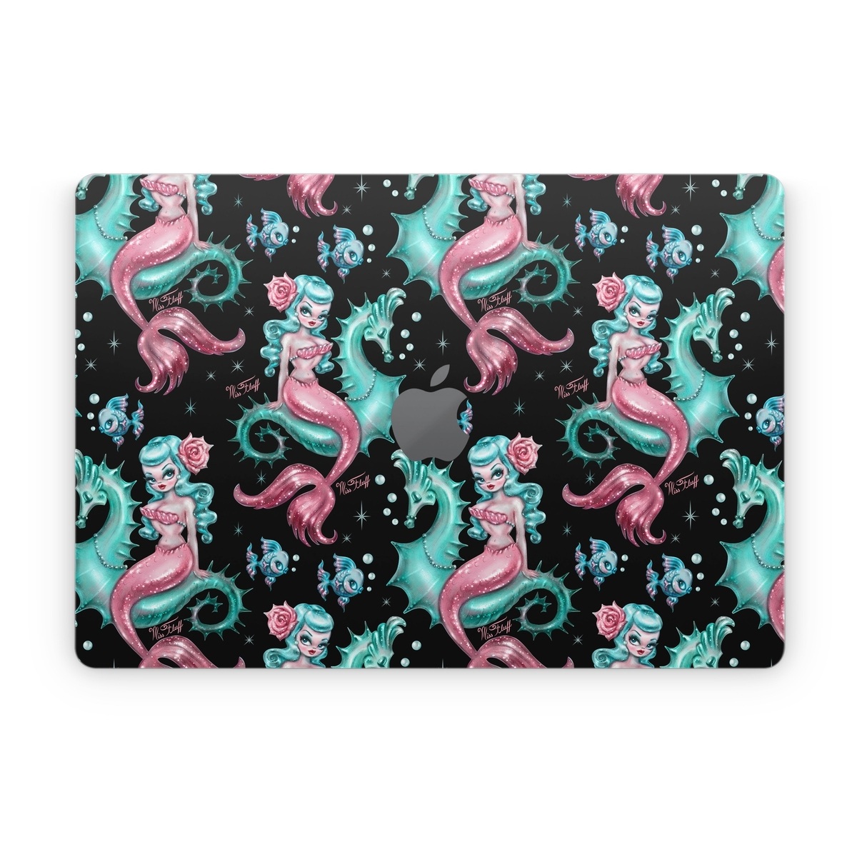 iStyles Apple MacBook Skin design of Pink, Pattern, Illustration, Organism, Design, Art, Textile, Visual arts, Graphic design, Fictional character, with black, green, pink, yellow colors, and tagged with fantasy, animals, flowers, beach, fish, glamor, mermaids, pinup, seahorses.