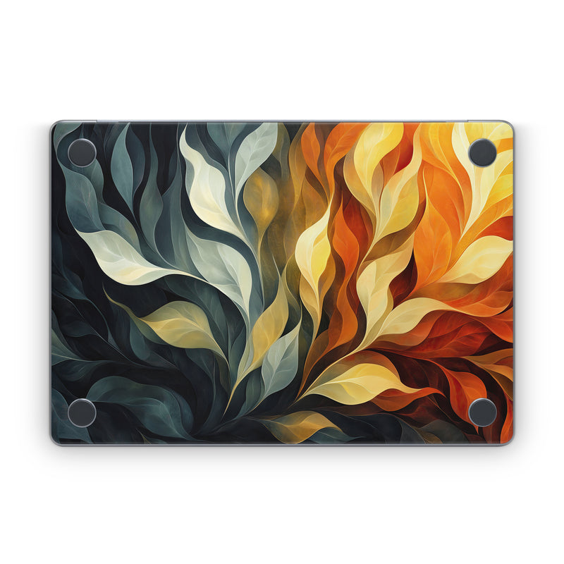 iStyles Apple MacBook Skin design of Yellow, Orange, Art, Brown, Visual arts, Modern art, Design, Graphics, Fractal art, Paint, with red, orange, yellow, white, black, gray colors, and tagged with abstract, nature, fire, burning, ashes.
