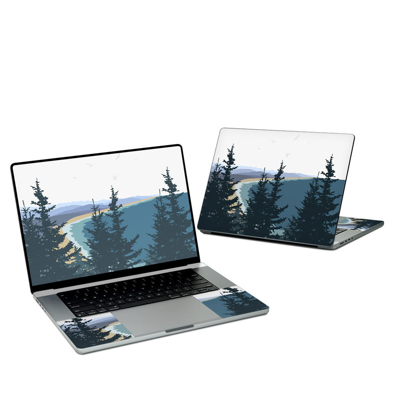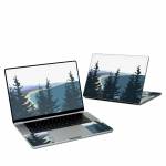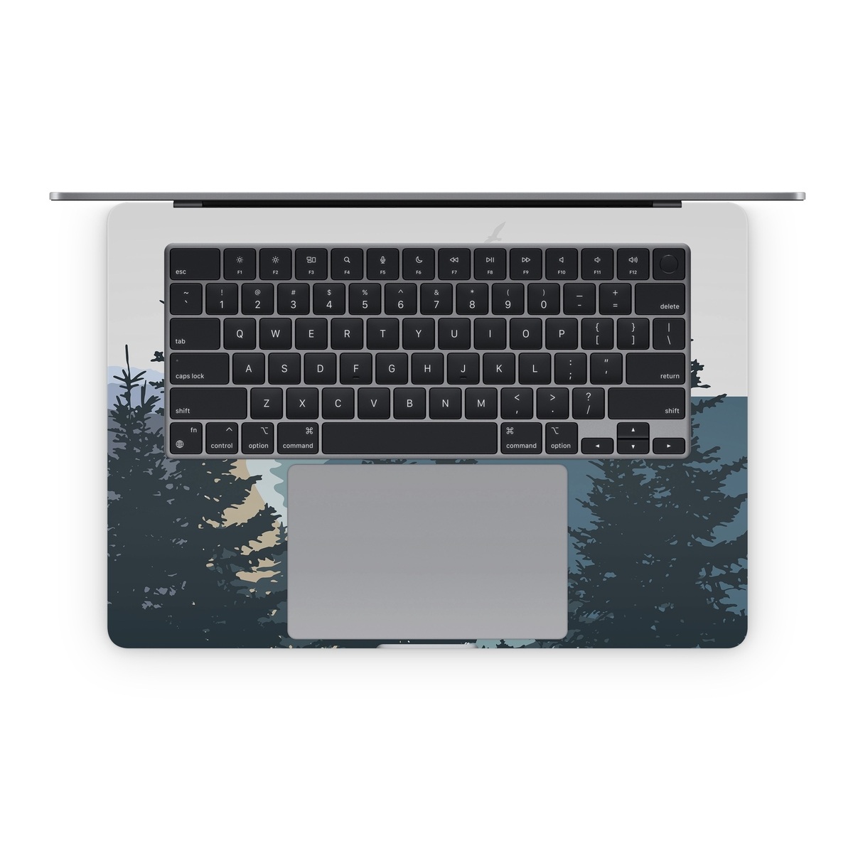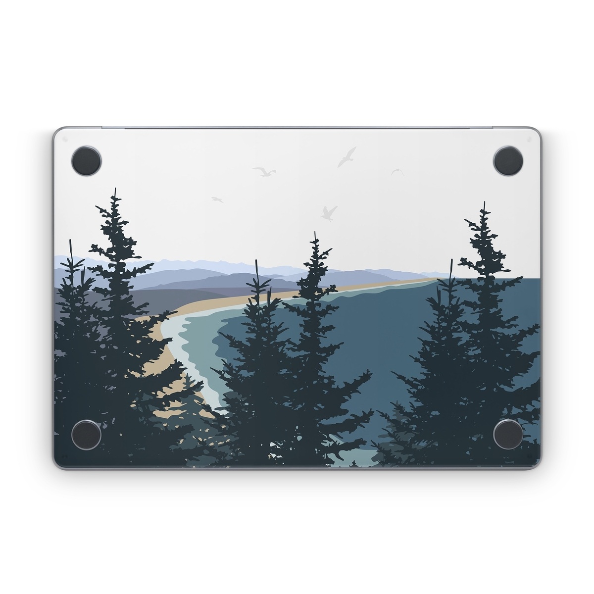 iStyles Apple MacBook Skin design of Sky, Plant, Mountain, Natural landscape, Branch, Larch, Tree, Highland, Atmospheric phenomenon, Evergreen, with white, blue, yellow, gray, black, green colors, and tagged with nature, animals, ocean, beach, landscape, forest, trees, seagulls.