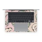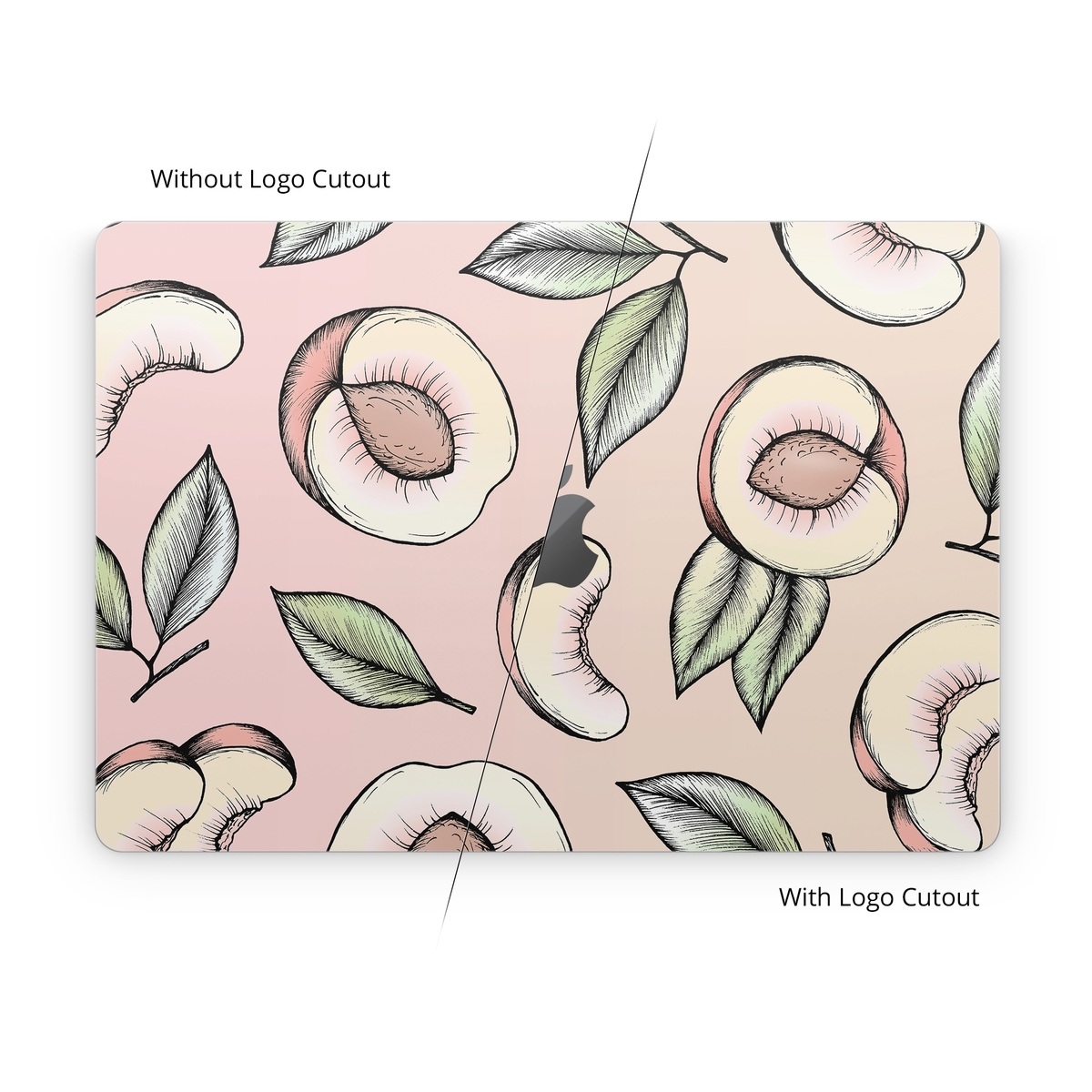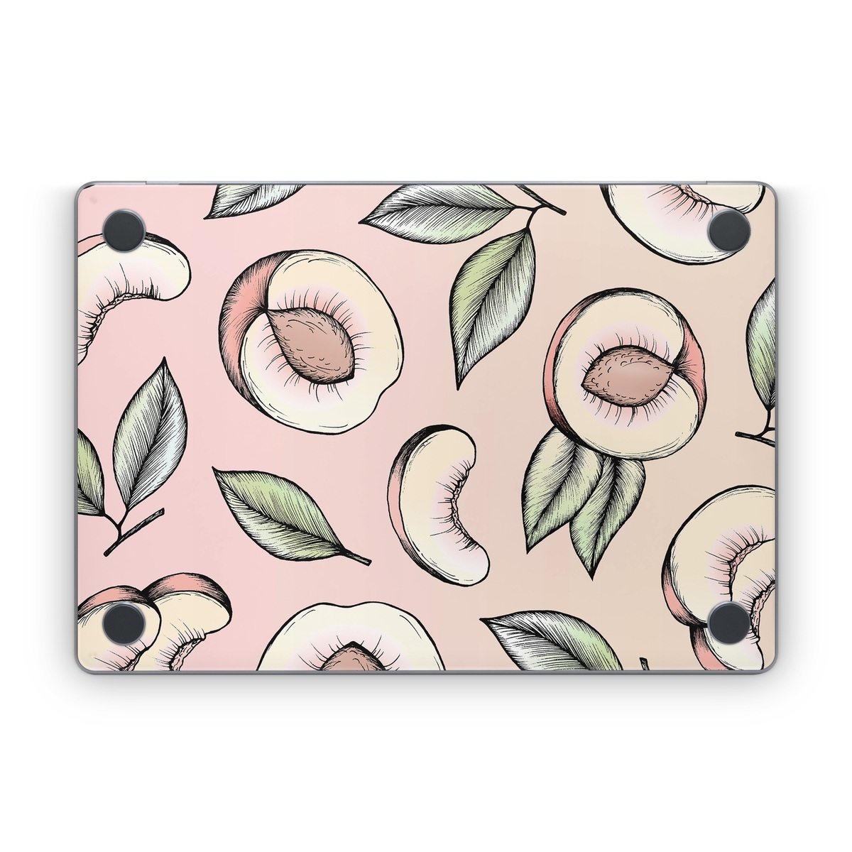 iStyles Apple MacBook Skin design of Pattern, Leaf, Botany, Organism, Design, Plant, Illustration, Clip art, with pink, green, yellow, orange colors, and tagged with objects, patterns, fruit, leaf, leaves, nature, outdoors, pastel, peach, peaches, sketch.