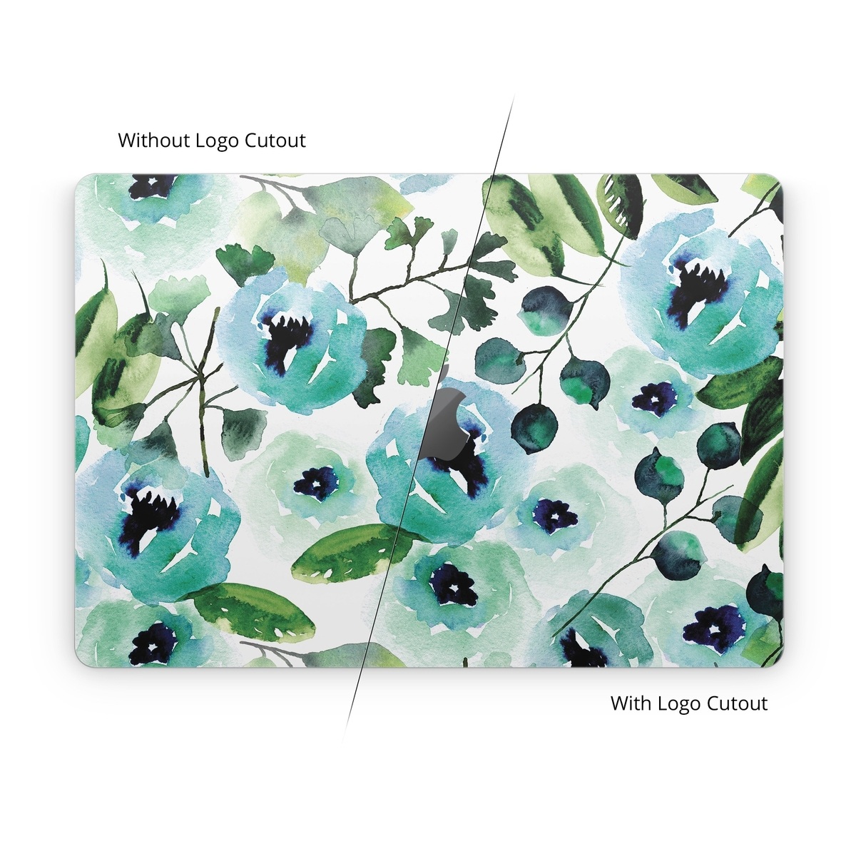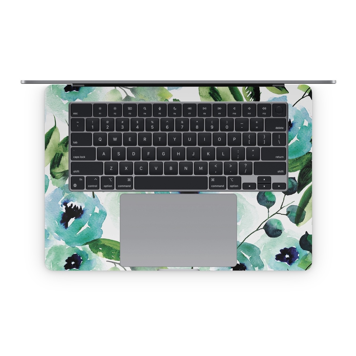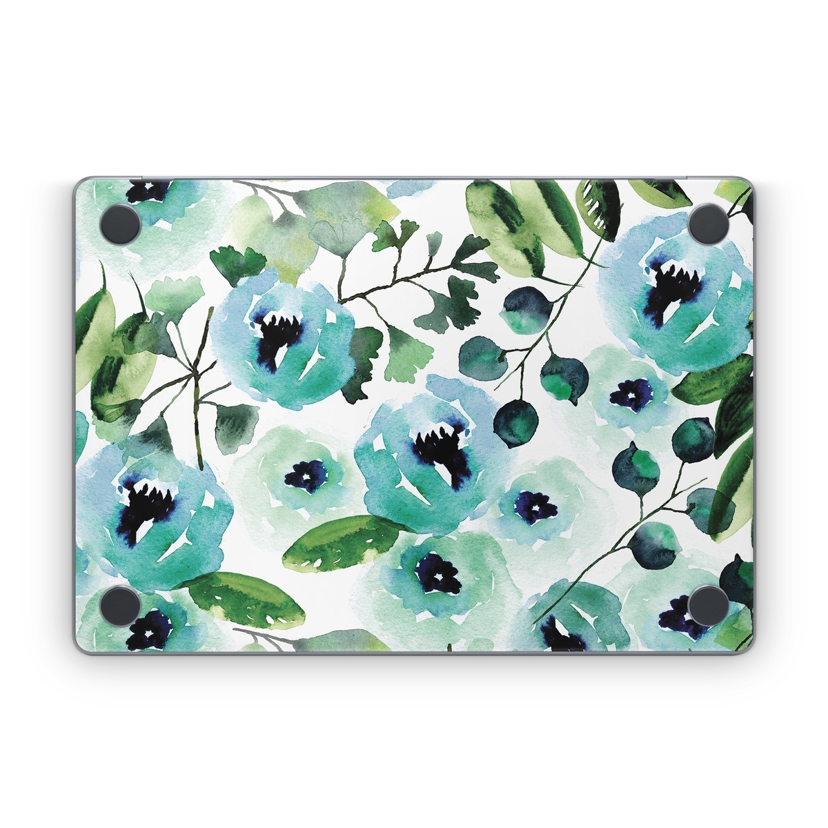 iStyles Apple MacBook Skin design of Green, Pattern, Leaf, Aqua, Plant, Design, Branch, Organism, Flower, Ivy, with white, green, blue, black colors, and tagged with flowers, patterns, floral, flowers, pattern, peonies, sara, saraberrenson, watercolor.