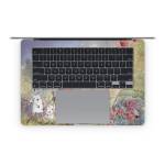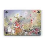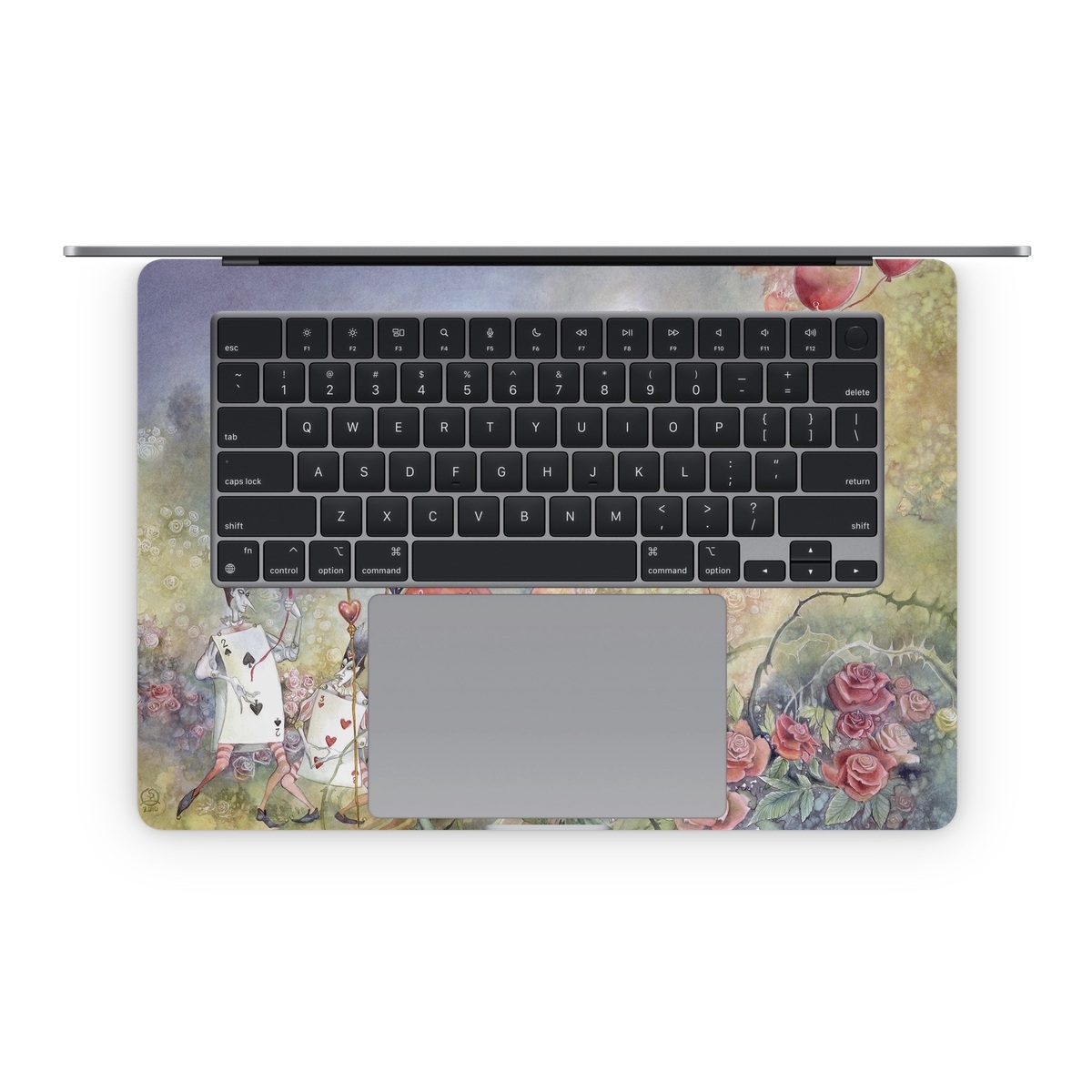 iStyles Apple MacBook Skin design of Watercolor paint, Painting, Art, Illustration, Spring, Flower, Fictional character, Blossom, Plant, Visual arts, with red, pink, white, black, blue, yellow, green colors, and tagged with animals, fantasy, flowers, objects, people, nature, birds, cards, fantasy, queen, rabbit, roses.