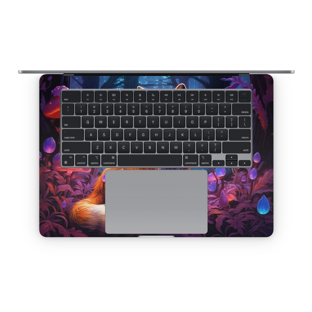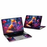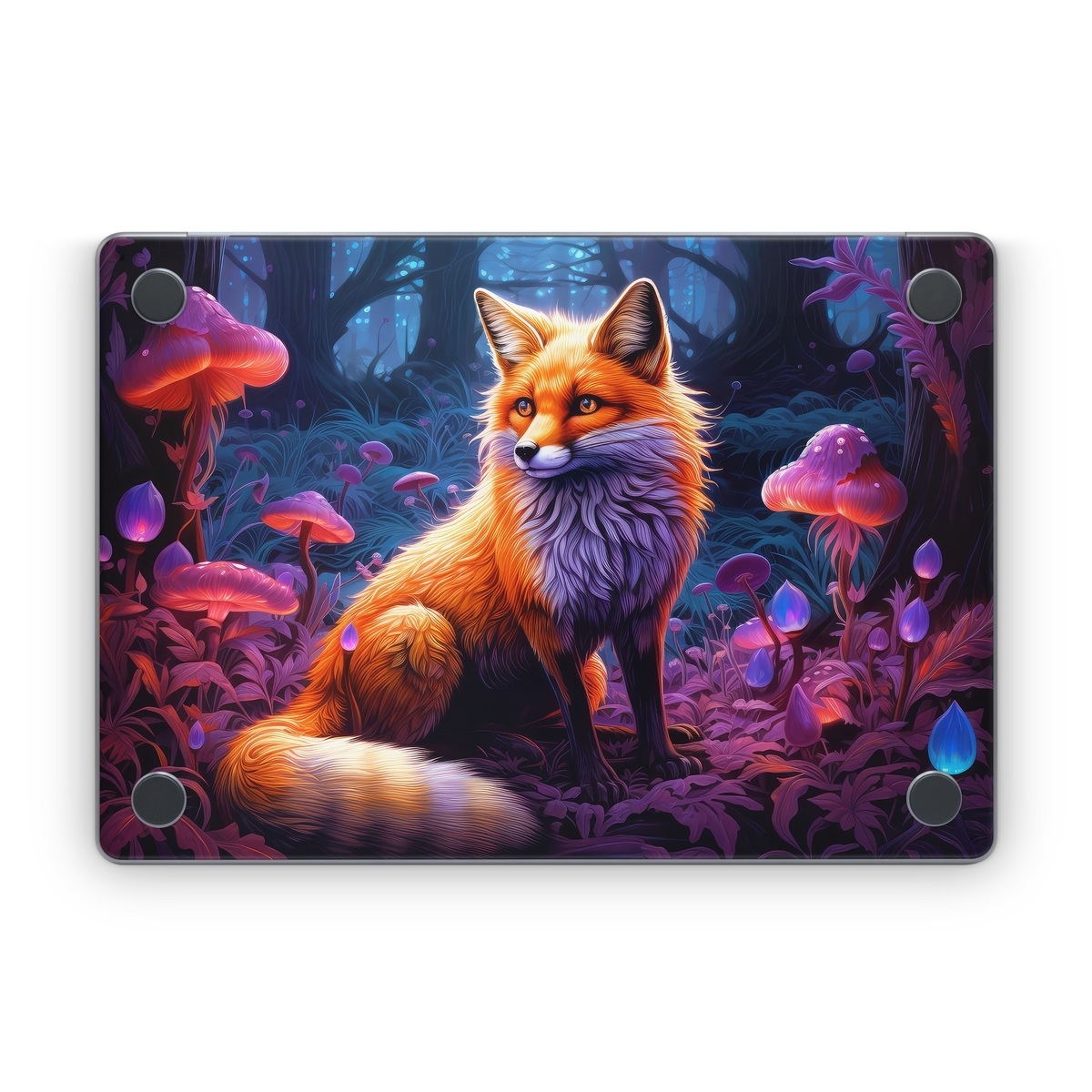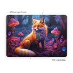iStyles Apple MacBook Skin design of Plant, Light, Carnivore, Orange, Organism, Tree, Pink, Natural landscape, Fawn, Whiskers, with red, orange, white, black, purple, gray, green colors, and tagged with animals, nature, fineart, fox, forest, mushrooms, trees, dusk, glow, bushy, tail.
