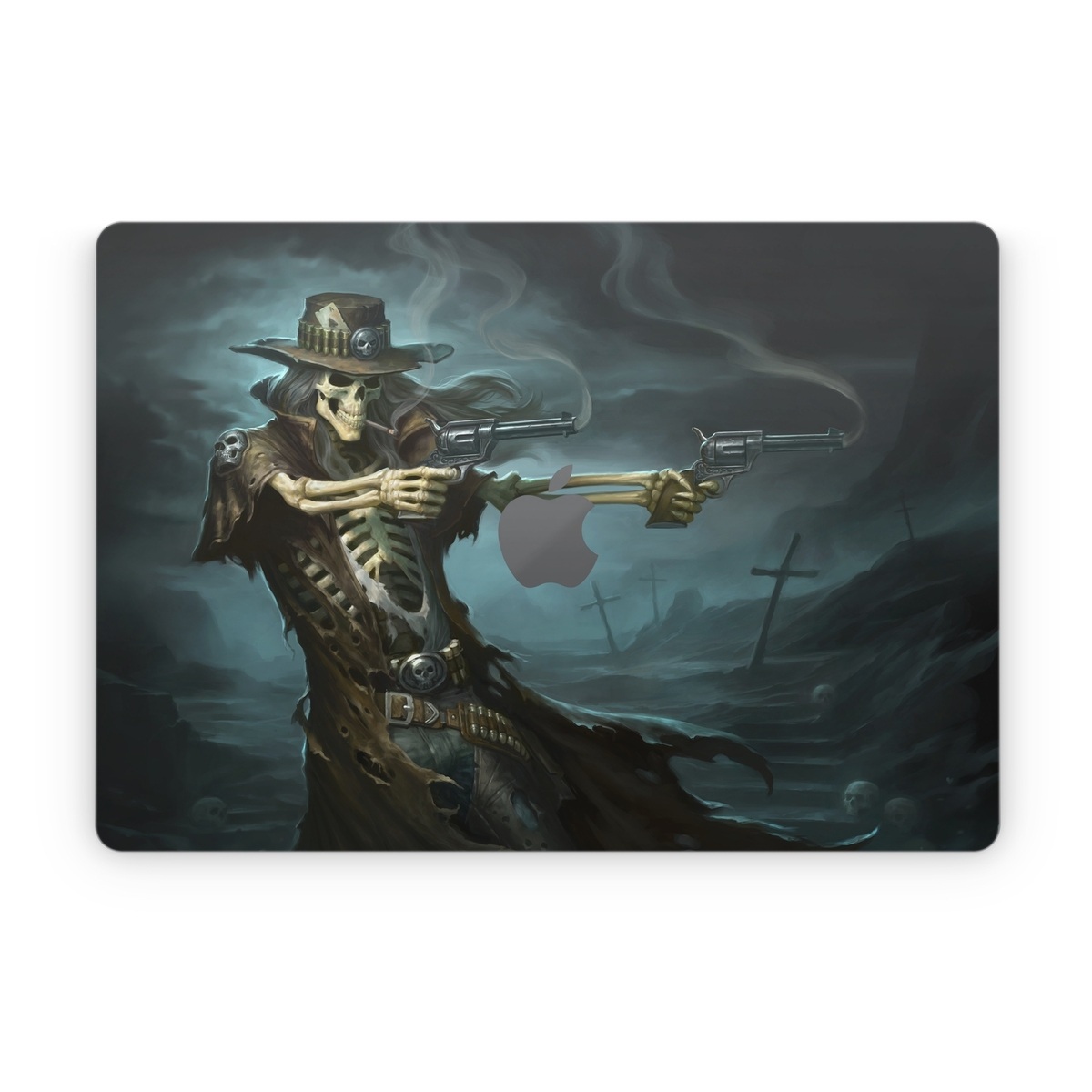 iStyles Apple MacBook Skin design of Cg artwork, Action-adventure game, Darkness, Illustration, Games, Adventure game, Pc game, Woman warrior, Digital compositing, Fictional character, with black, white, blue, gray colors, and tagged with fantasy, skulls, people, bullets, fantasy, gaming, guns, skeleton, skull.