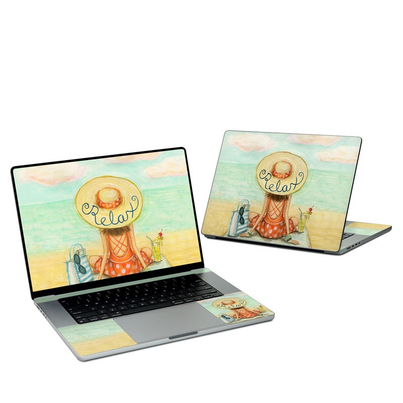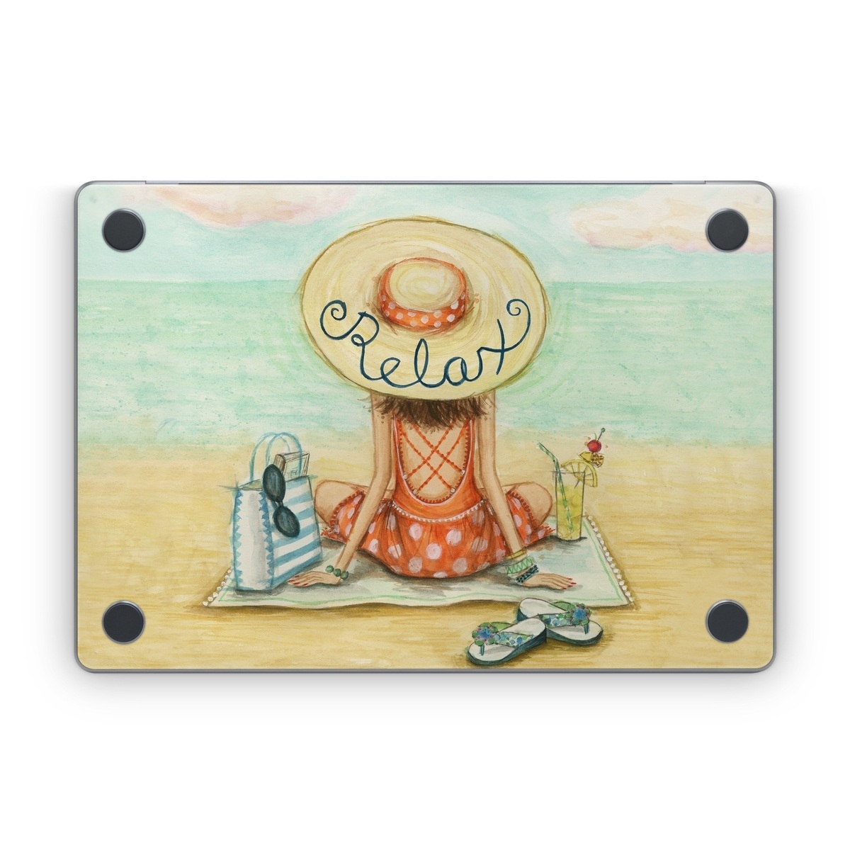 iStyles Apple MacBook Skin design of Illustration, Cartoon, Watercolor paint, Art, Drawing, Child art, Sketch, Paint, Still life, with white, yellow, blue, red, black, yellow colors, and tagged with people, fineart, nature, objects, beach, drawn, fashion, handdrawn, ocean, sand, summer, vacation, water, drink, cocktail, sunglasses, bag, mat, hat, clouds, sea, sand.