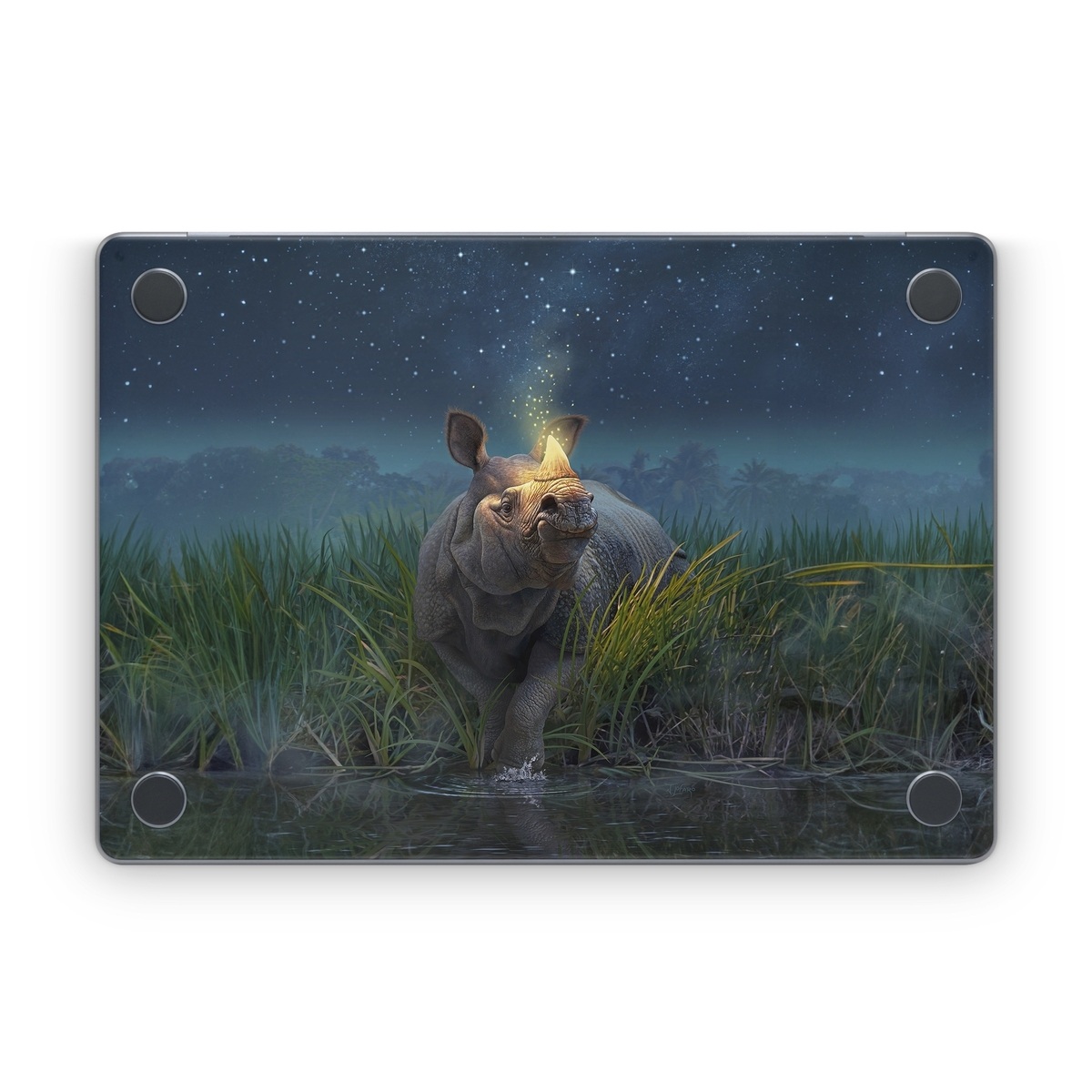 iStyles Apple MacBook Skin design of Wildlife, Sky, Photography, Grass, Fawn, with blue, green, gray, yellow, white colors, and tagged with animals, nature, animals, fantasy, rhino, sci-fi.