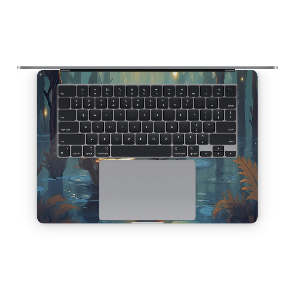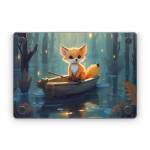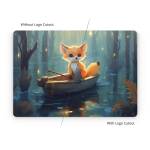 iStyles Apple MacBook Skin design of Water, Boat, Light, Nature, Organism, Orange, Cartoon, Watercraft, Art, Plant, with blue, yellow, orange, white, black, gray, green, brown colors, and tagged with fineart, animals, objects, fantasy, nature, fox, boat, character, water, lilies, paddle.