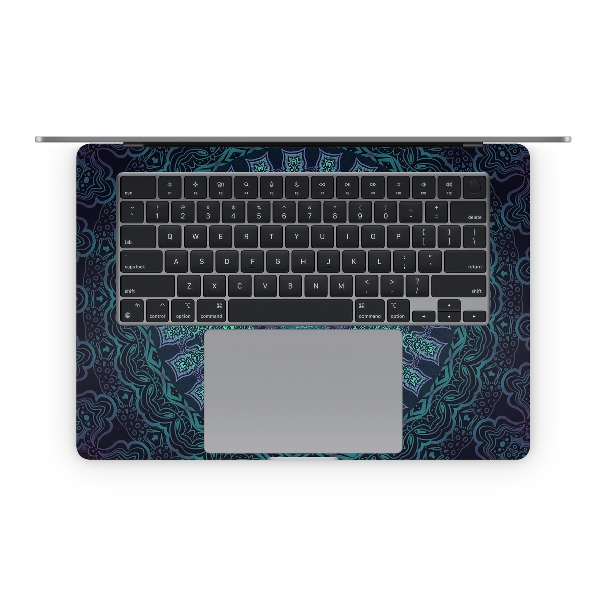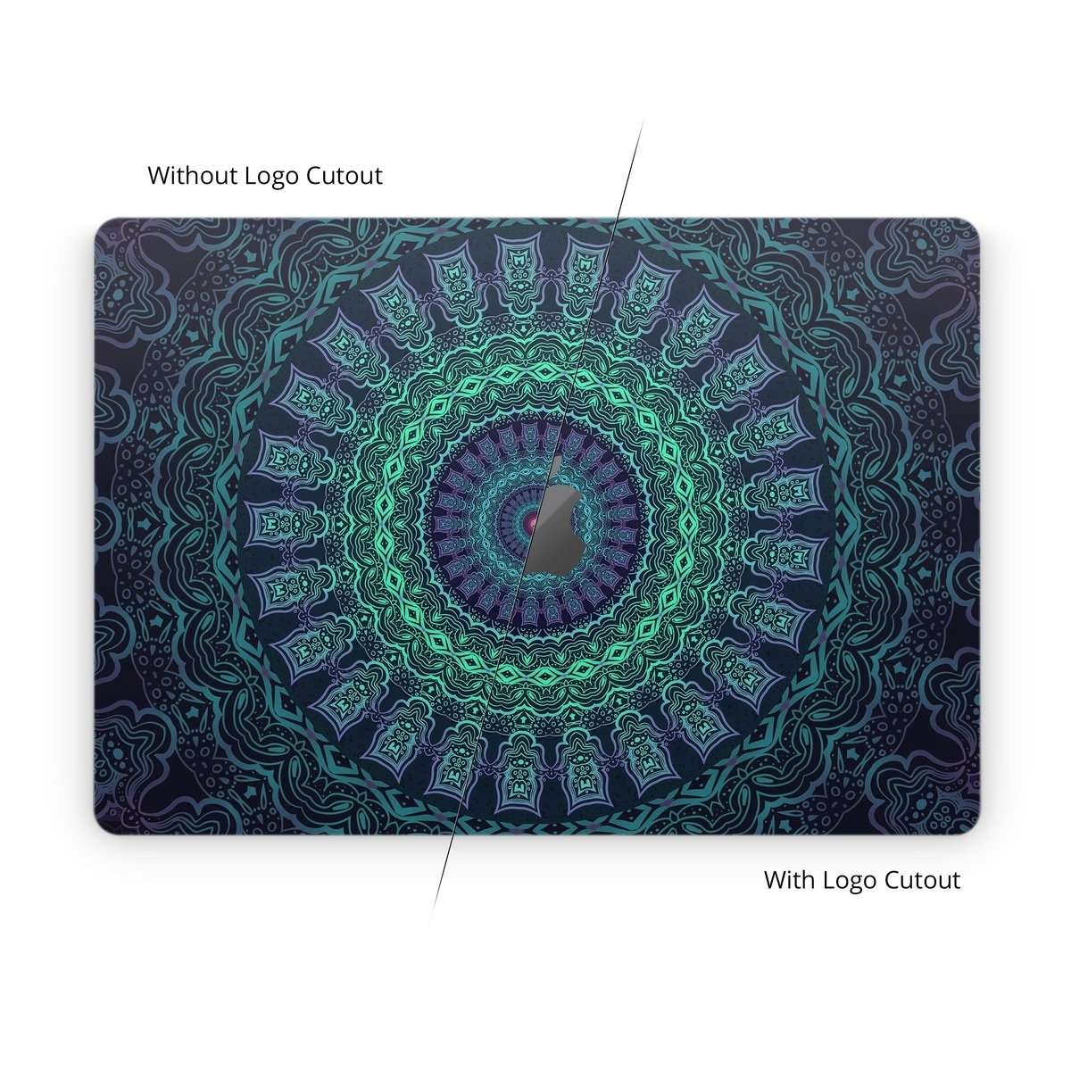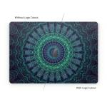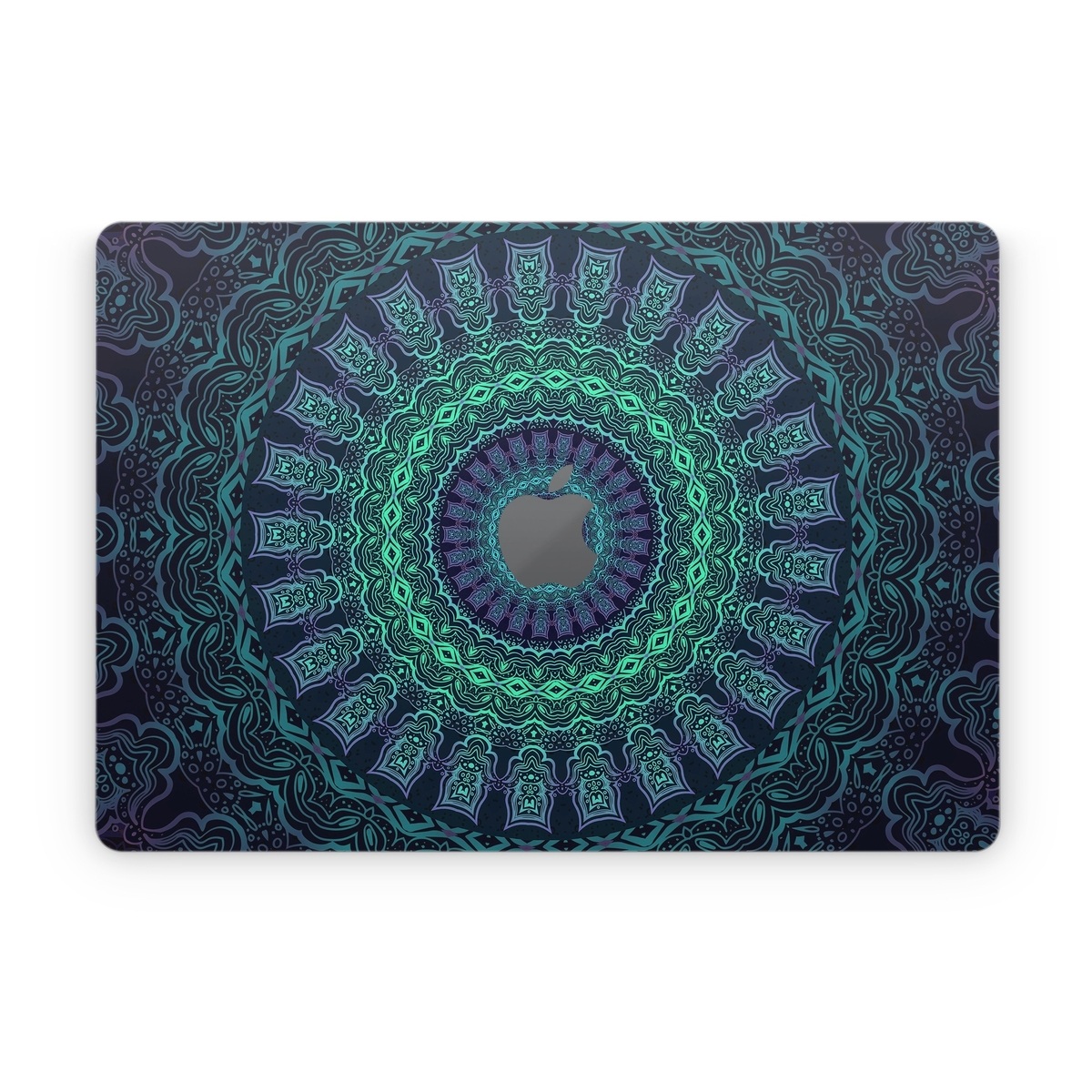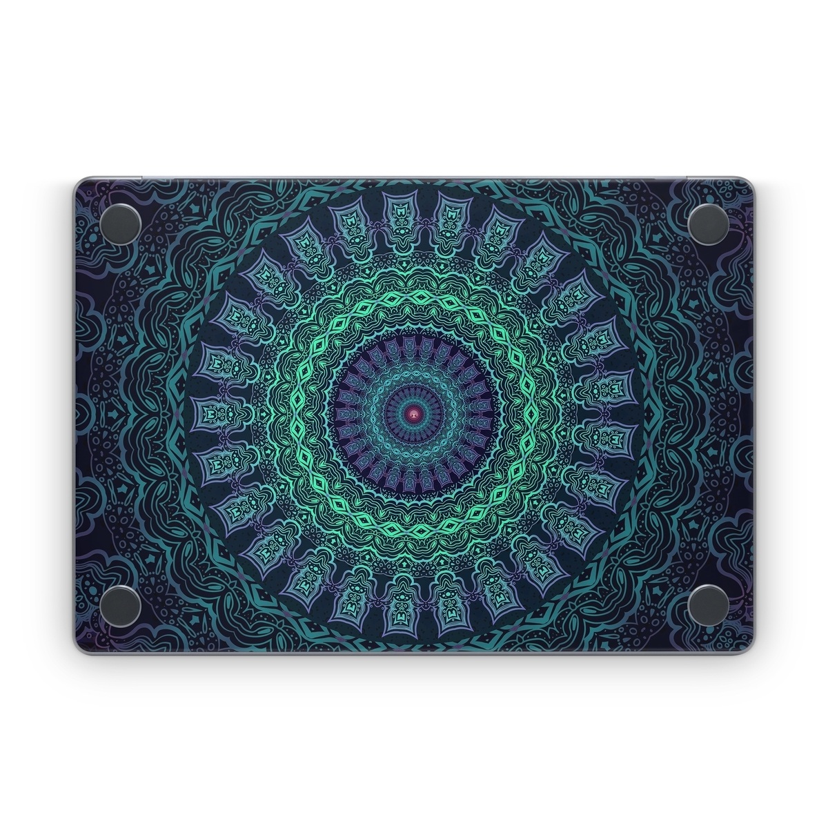 iStyles Apple MacBook Skin design of Colorfulness, Blue, Green, Pattern, Teal, Turquoise, Art, Electric Blue, Aqua, Circle, Majorelle Blue, Visual Arts, Fractal Art, Design, Symmetry, Psychedelic Art, Graphics, Kaleidoscope, Motif, with black, green, red colors, and tagged with patterns, fractals, balance, blue, circle, green, mandala, neon, purple, rainbow, symmetry.