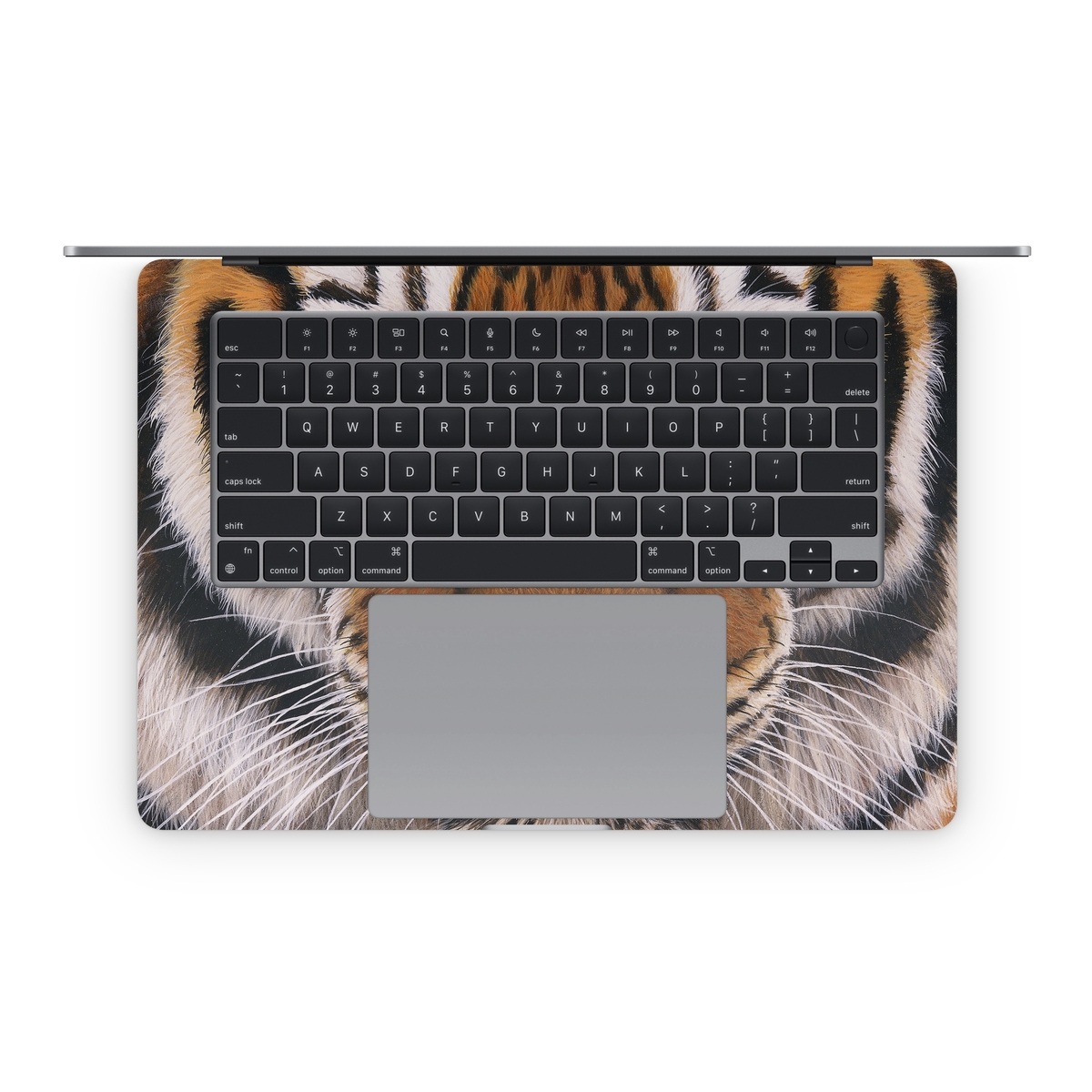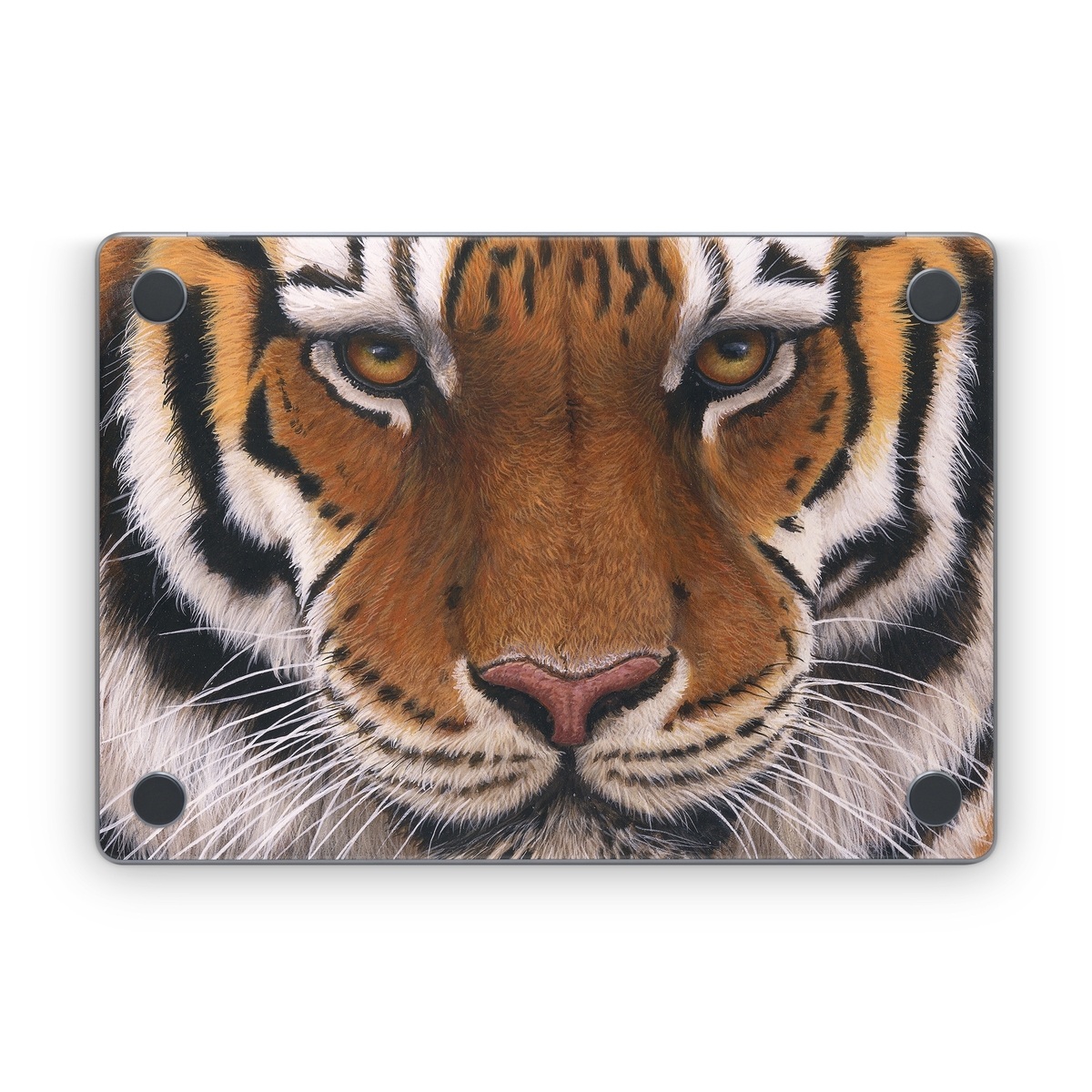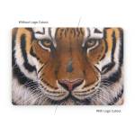 iStyles Apple MacBook Skin design of Tiger, Mammal, Wildlife, Terrestrial animal, Vertebrate, Bengal tiger, Whiskers, Siberian tiger, Felidae, Snout, with black, gray, red, green, pink colors, and tagged with animals.