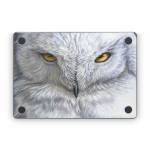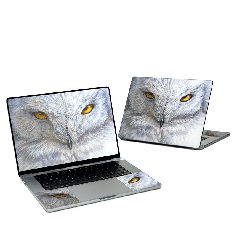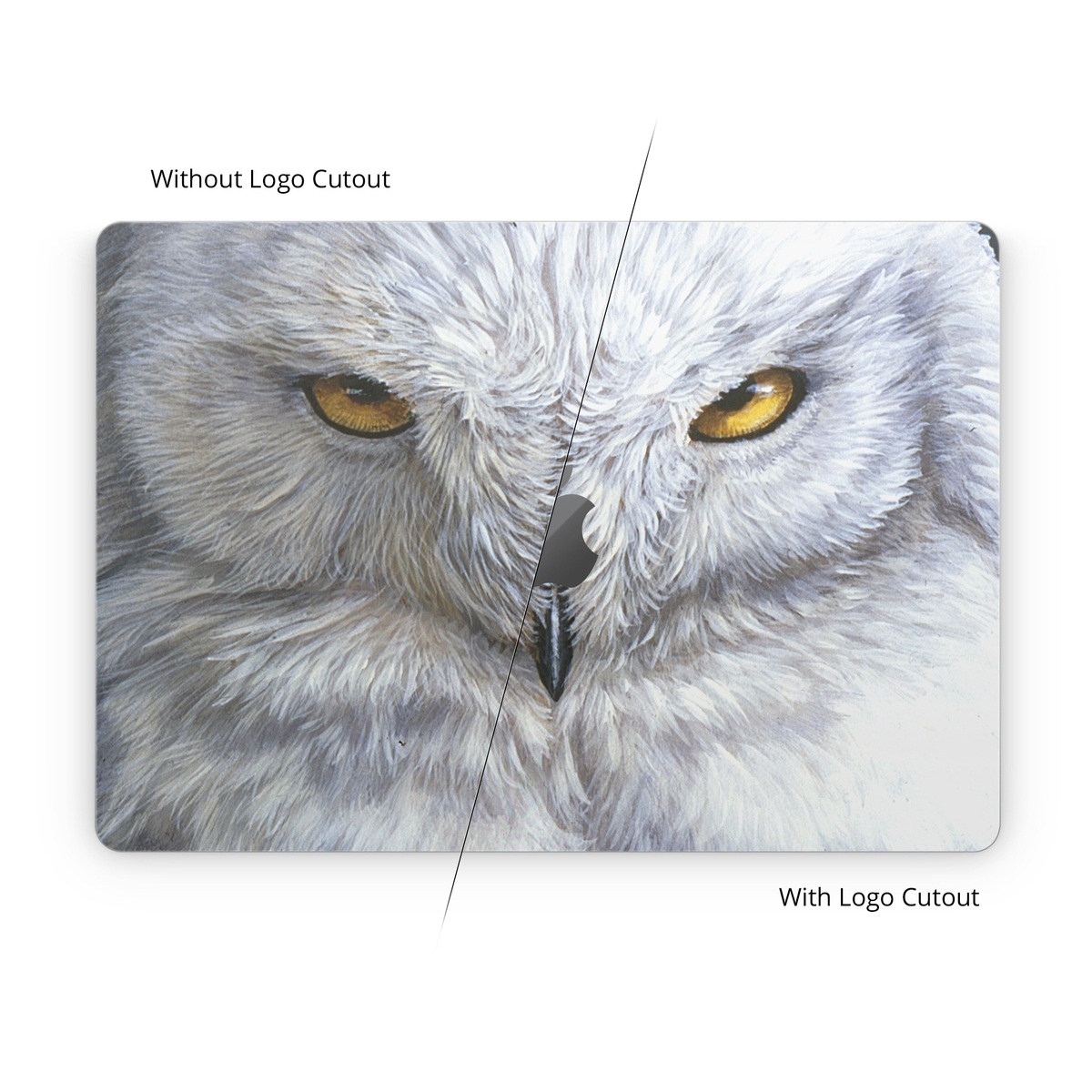 iStyles Apple MacBook Skin design of Owl, Bird, Bird of prey, Snowy owl, great grey owl, Close-up, Eye, Snout, Wildlife, Eastern Screech owl, with gray, white, black, blue, purple colors, and tagged with animals.