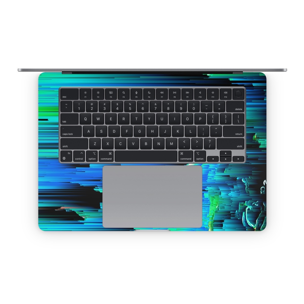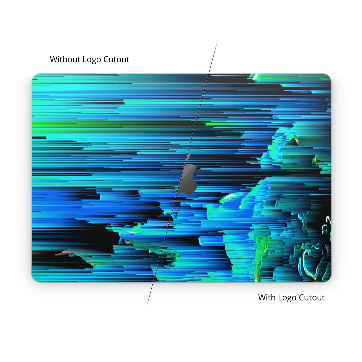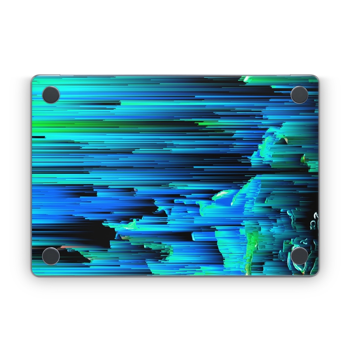iStyles Apple MacBook Skin design of Blue, Green, Turquoise, Light, Colorfulness, Electric blue, with blue, green, black, white colors, and tagged with abstract, space, blue, geometric, geometry, glitch, green, lines, shapes, space.