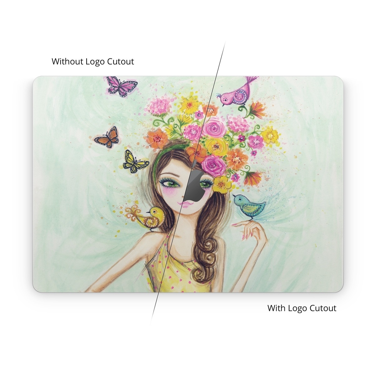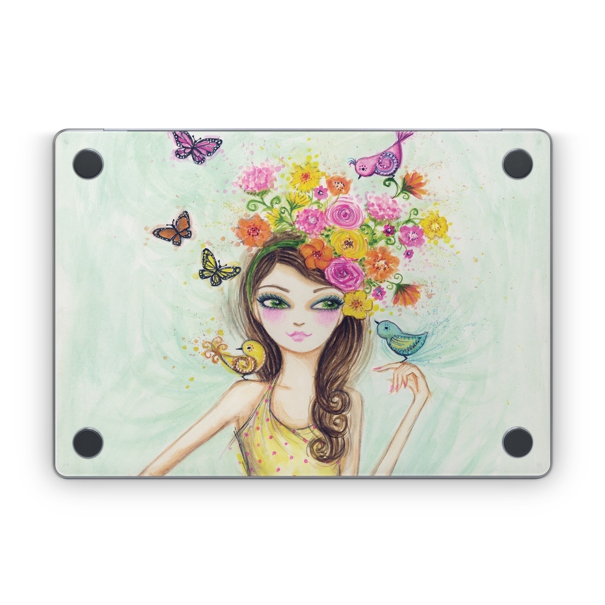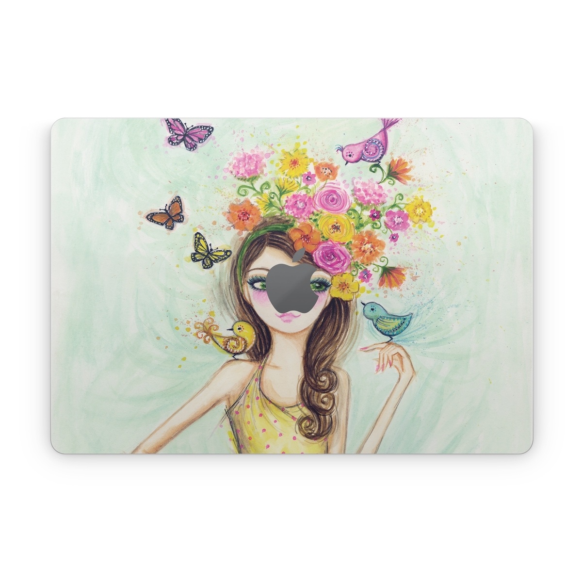 iStyles Apple MacBook Skin design of Pink, Illustration, Fashion illustration, Watercolor paint, Fictional character, Dress, Hair accessory, Wildflower, Costume, Plant, with blue, pink, yellow, orange, purple, brown, green colors, and tagged with people, fineart, animals, flowers, fashion, birds, dresses, fashion, flowers, spring.