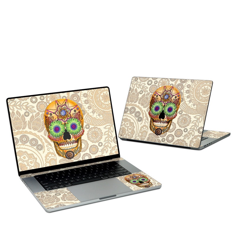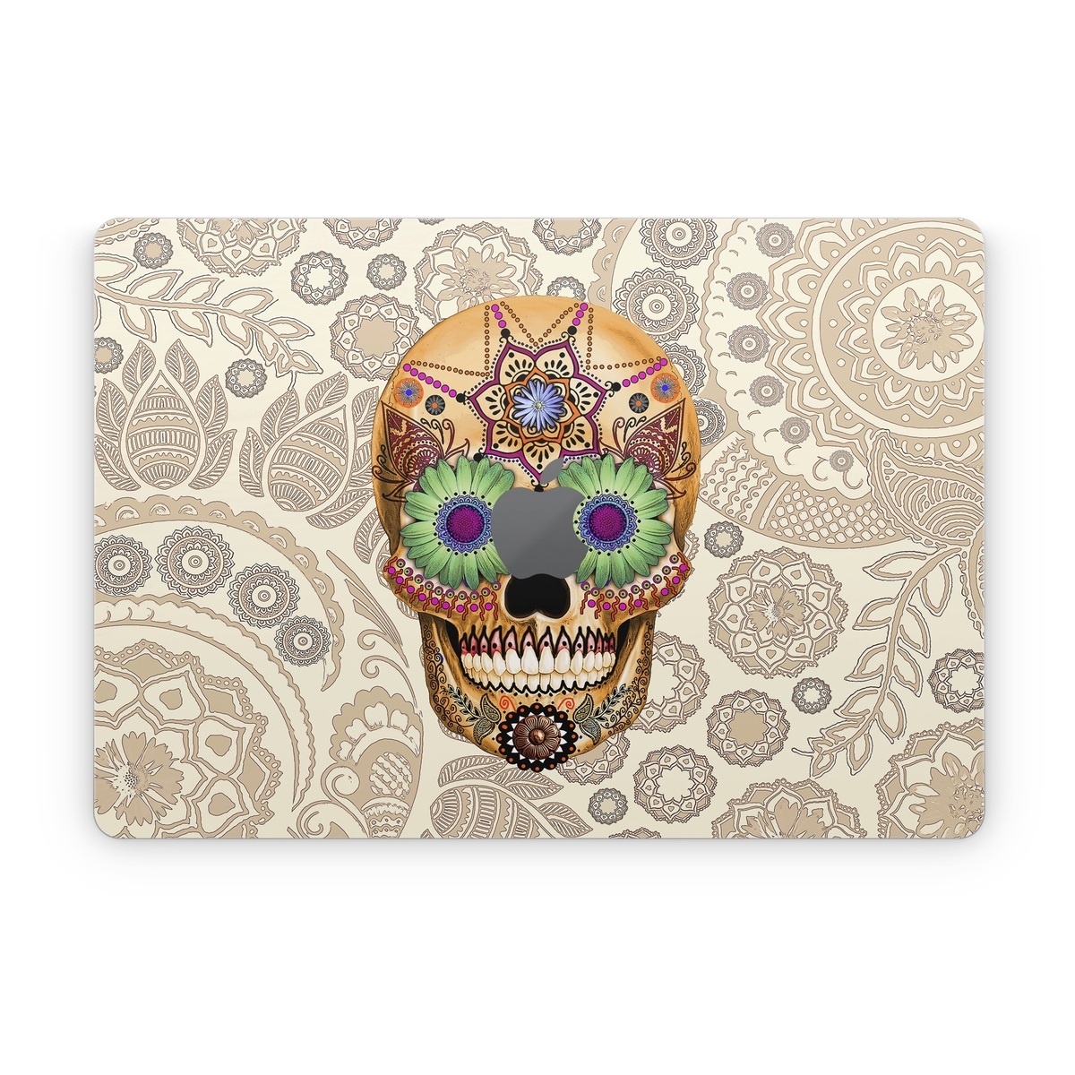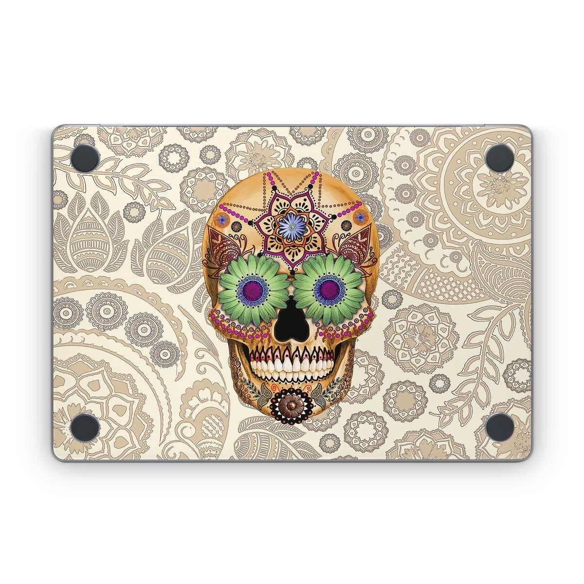 iStyles Apple MacBook Skin design of Skull, Bone, Pattern, Design, Illustration, Visual arts, Fashion accessory, Art, with gray, yellow, green, black, red, pink colors, and tagged with patterns, skulls, flowers, nature.
