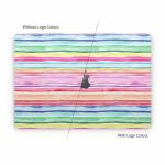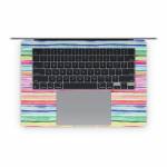 The MacBook inner Skins are precision cut to cover the area around the keyboard - the complexity and large size of this surface does make Skin alignment a little more tricky but the final effect when it's done properly is well worth the effort. What we generally do during Skin application is to first align the Skin to the major physical cutouts, and in this case, that will be the trackpad area. Peel the whole inner Skin off and start with the bottom half; hold the Skin at both ends of the wrist rest area and gently position until it aligns perfectly to the trackpad. One trick will be to keep the top half (the thin stripes that go beside the keyboard) folded back over the bottom half such that the stripes do not get stuck on your MacBook when you're positioning the bottom half. Once you've aligned the trackpad, everything else will fall in place with a little guidance.