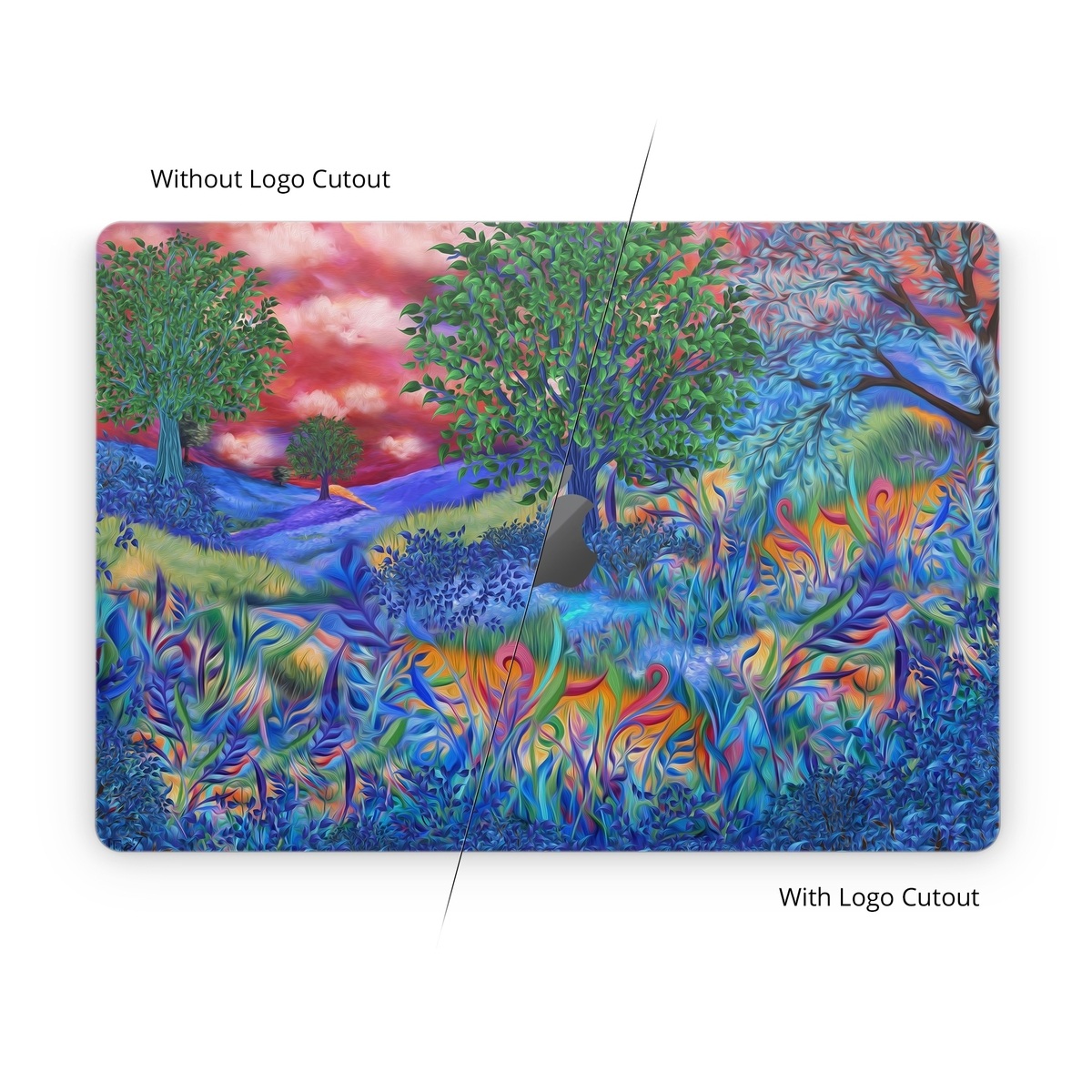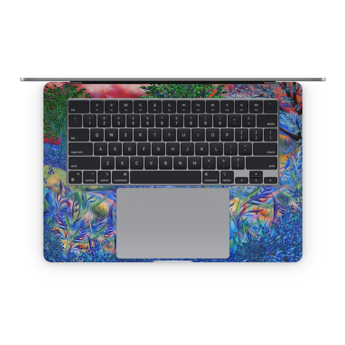 iStyles Apple MacBook Skin design of Art paint, Plant, Plant community, Paint, Natural landscape, People in nature, Vegetation, Grass, Art, Painting, with blue, red, green, orange, yellow, pink, white colors, and tagged with nature, fineart, blue, field, green, leaf, leaves, meadow, pink, purple, sun, sunset, tree, trees.