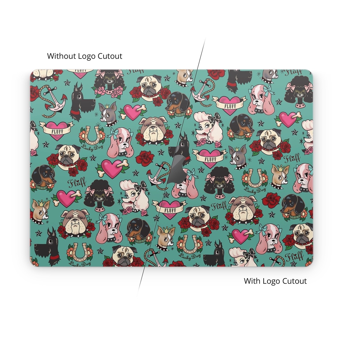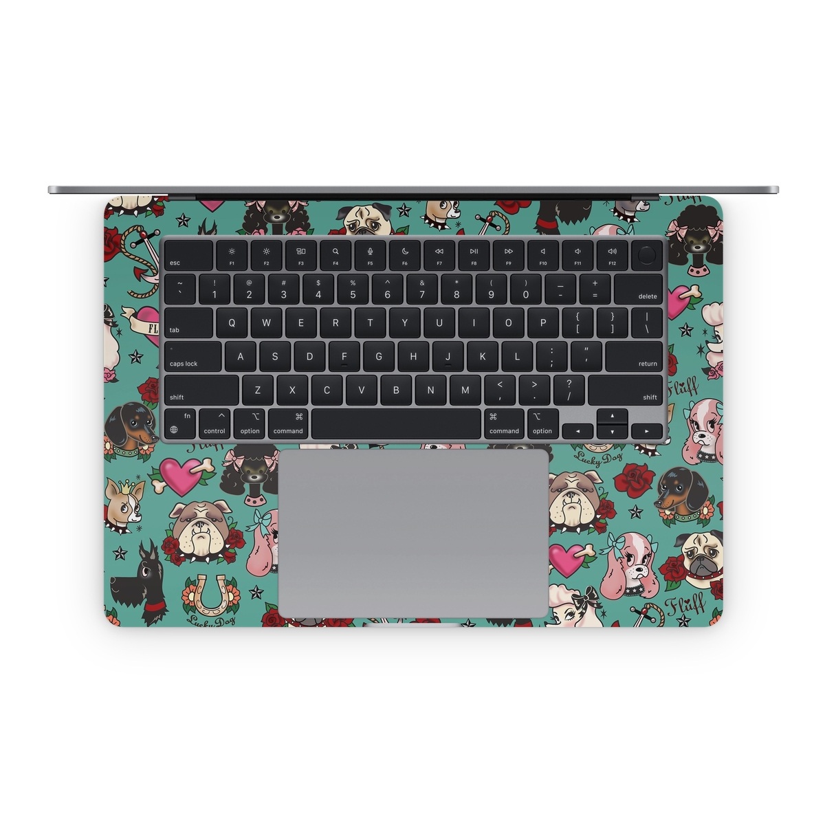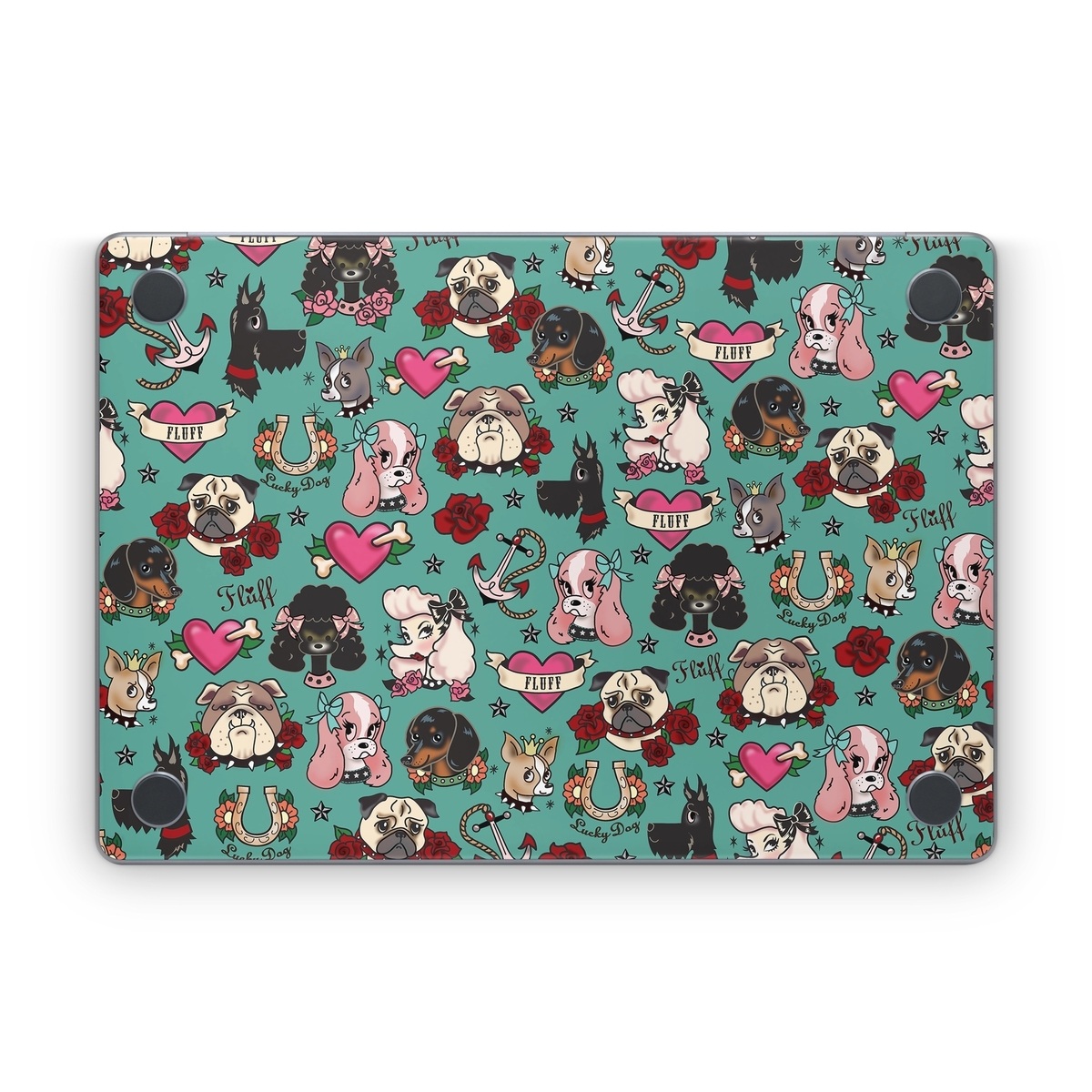 iStyles Apple MacBook Skin design of Cartoon, Pattern, Illustration, Design, Crowd, Textile, Art, with blue, brown, red, white, black, green, gray colors, and tagged with patterns, animals, flowers, objects, hearts, animals, dog, dogs, grunge, pattern, punk, retro, tattoo, tattoostyle.