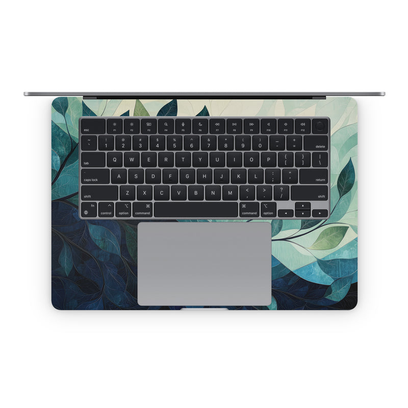 iStyles Apple MacBook Skin design of Blue, Natural material, Modern art, Wallpaper, Paint, Motif, with white, blue, green, yellow colors, and tagged with abstract, nature, leaves, nature.