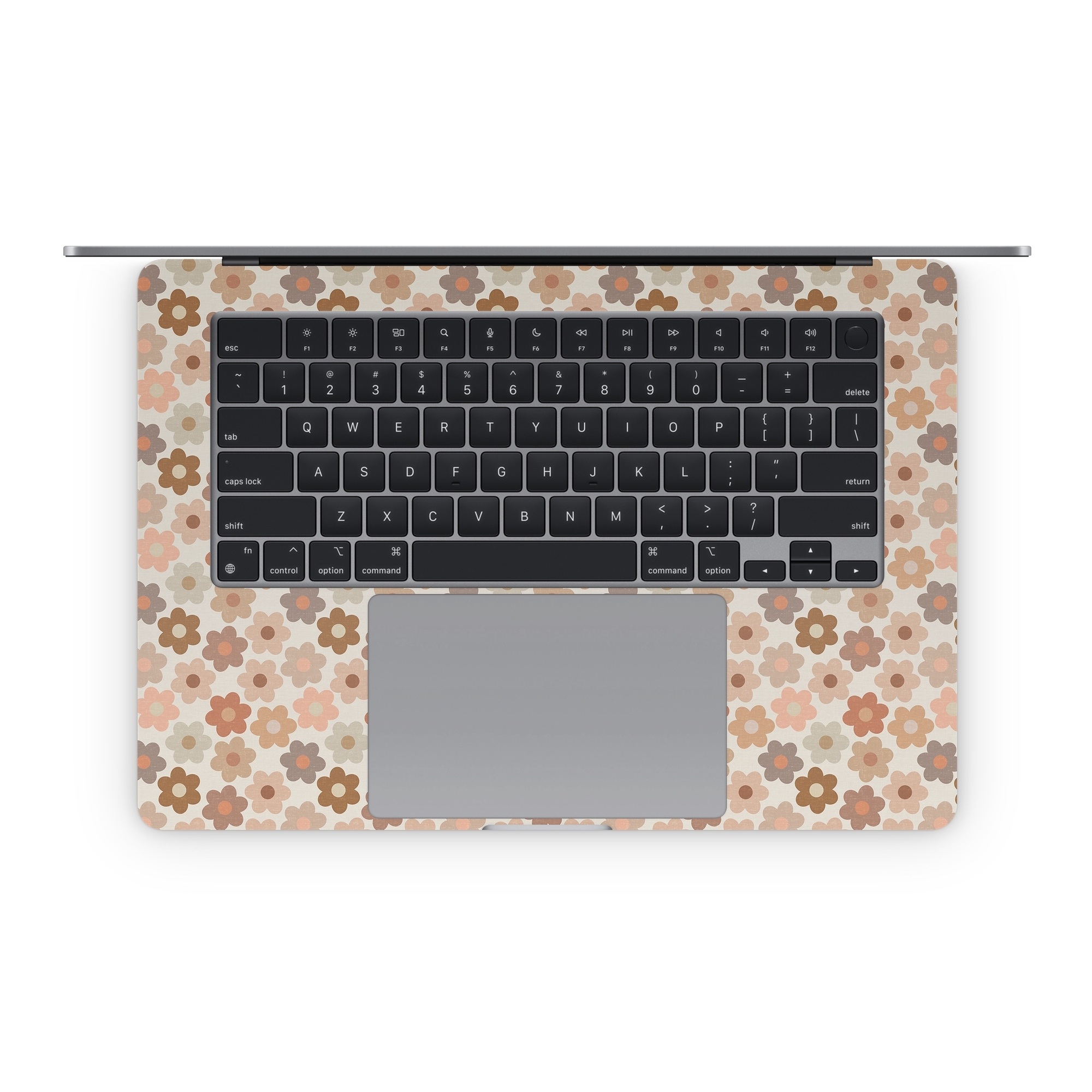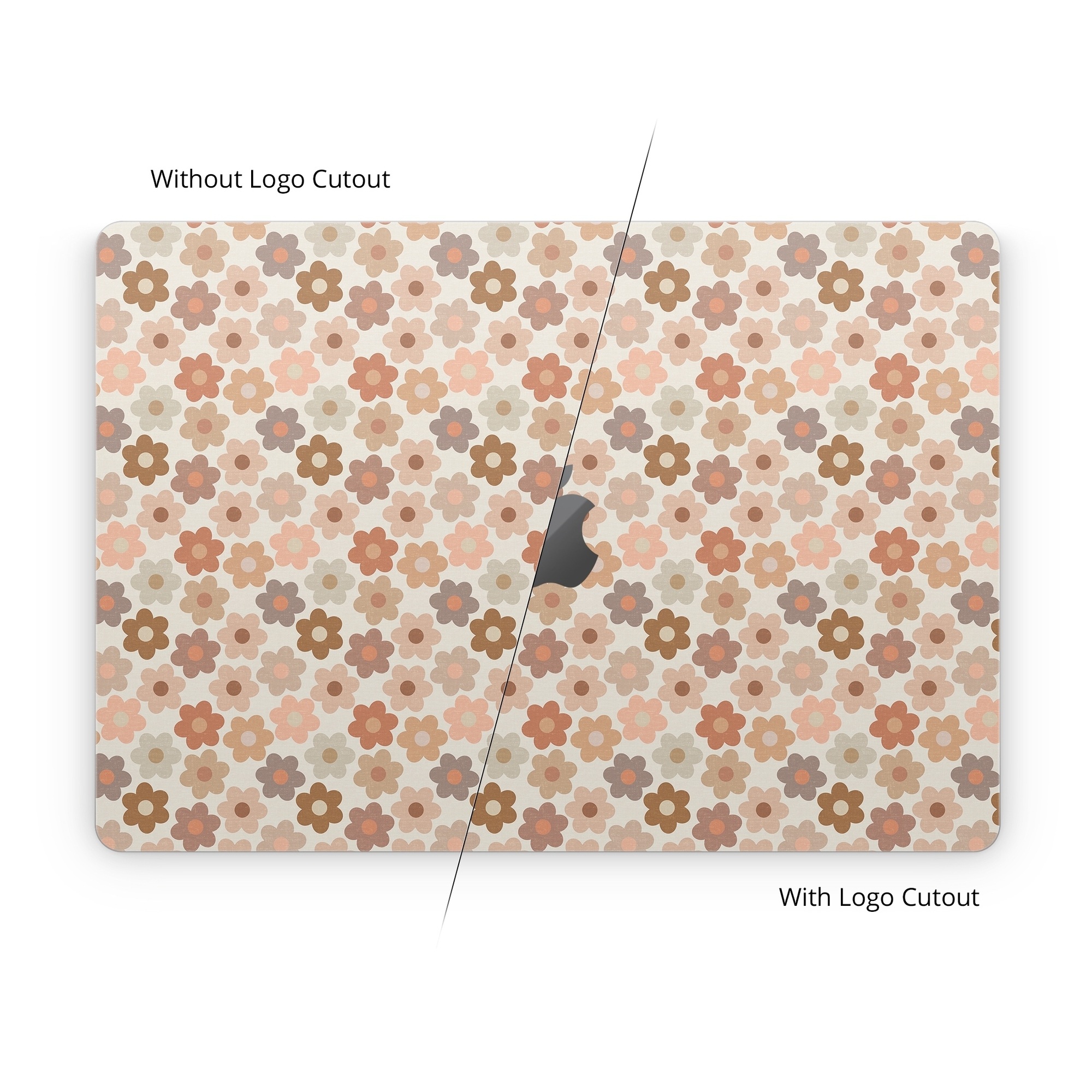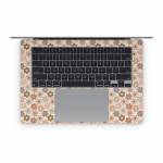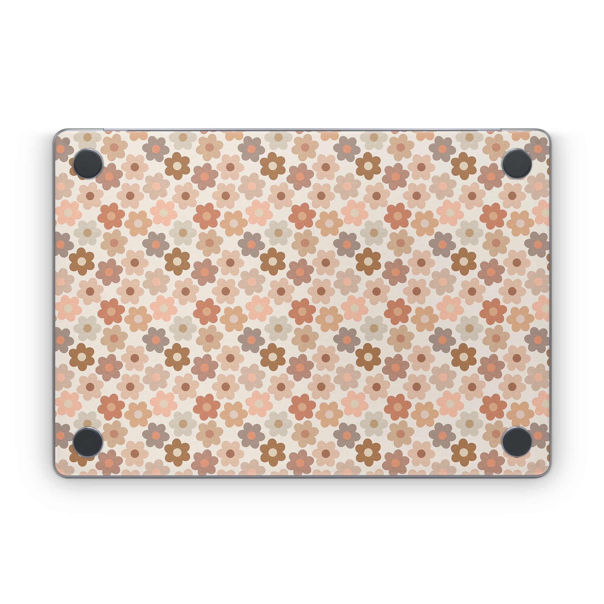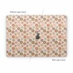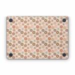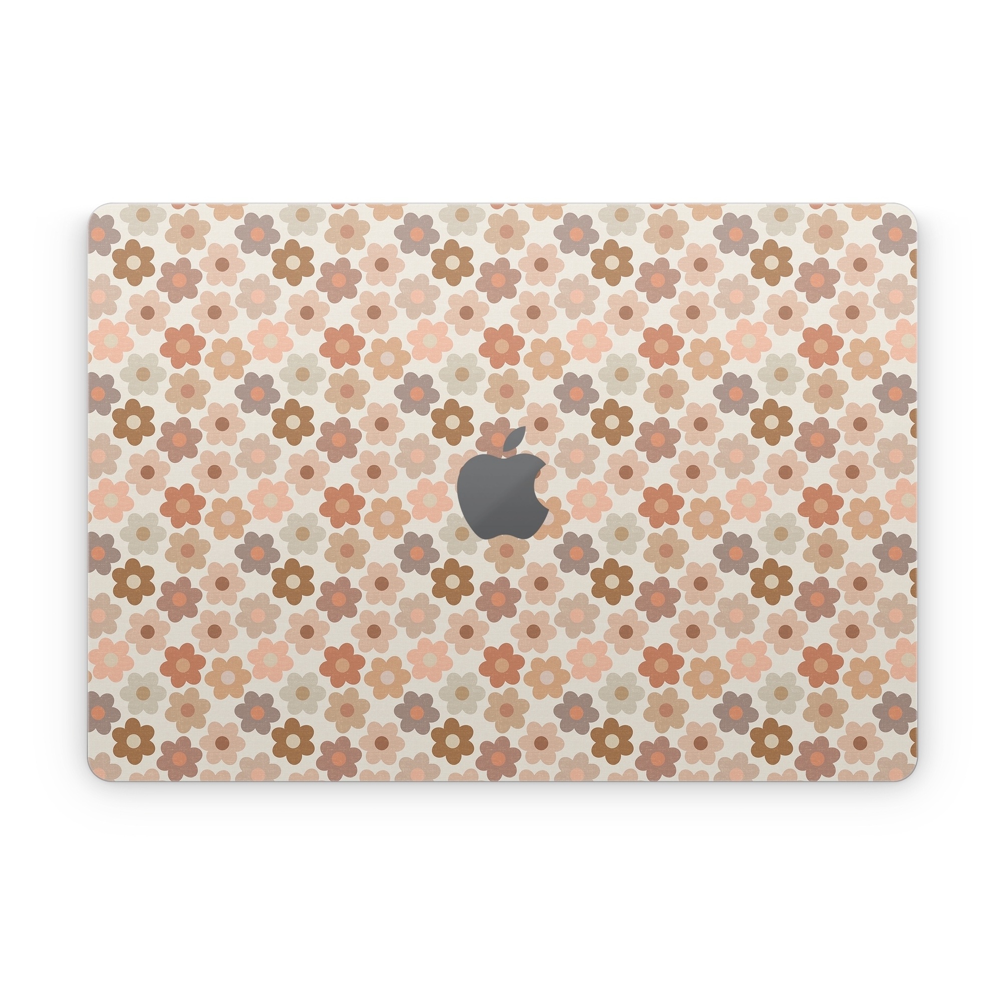 iStyles Apple MacBook Skin design of Brown, Orange, Textile, Material property, Pattern, Circle, Symmetry, Font, Tints and shades, Peach, with white, brown, yellow, pink colors, and tagged with patterns, flowers, flowers, daisy.