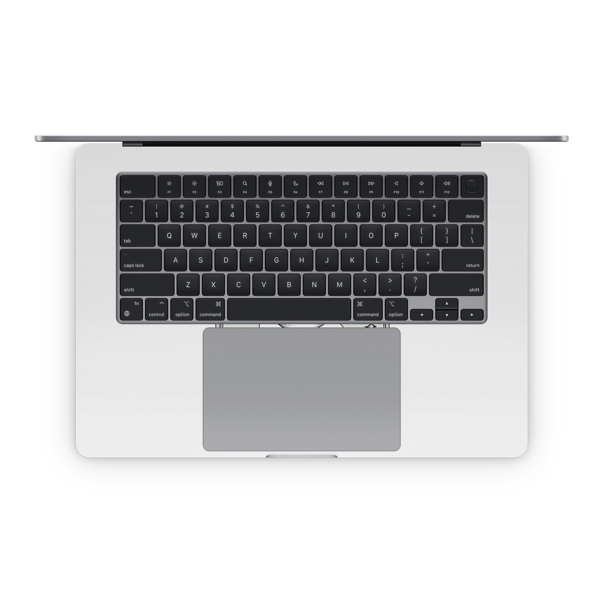 The MacBook inner Skins are precision cut to cover the area around the keyboard - the complexity and large size of this surface does make Skin alignment a little more tricky but the final effect when it's done properly is well worth the effort. What we generally do during Skin application is to first align the Skin to the major physical cutouts, and in this case, that will be the trackpad area. Peel the whole inner Skin off and start with the bottom half; hold the Skin at both ends of the wrist rest area and gently position until it aligns perfectly to the trackpad. One trick will be to keep the top half (the thin stripes that go beside the keyboard) folded back over the bottom half such that the stripes do not get stuck on your MacBook when you're positioning the bottom half. Once you've aligned the trackpad, everything else will fall in place with a little guidance.