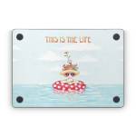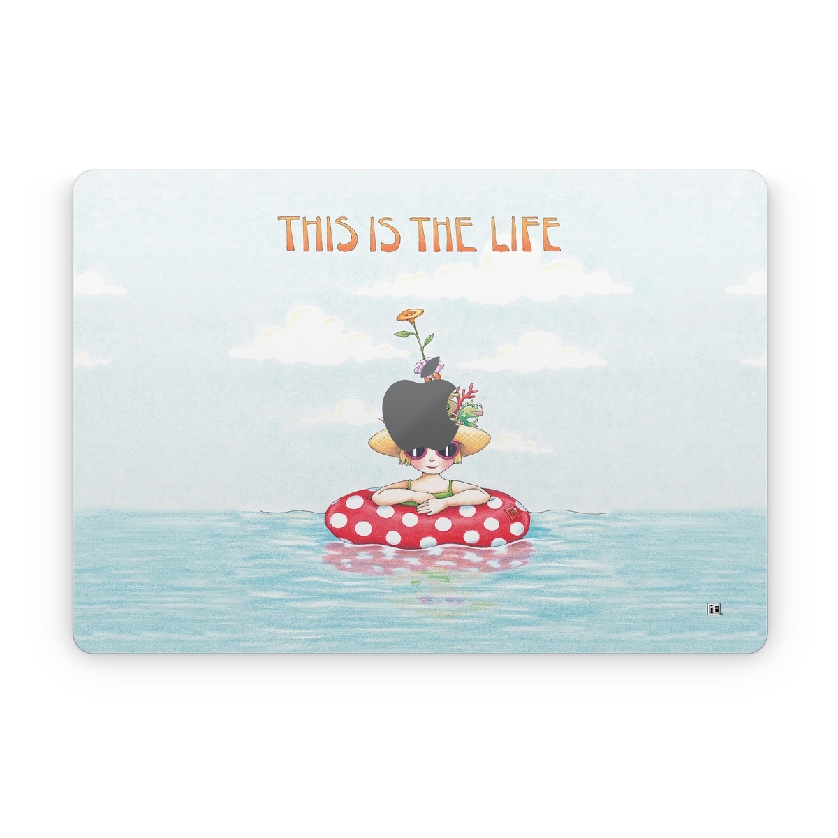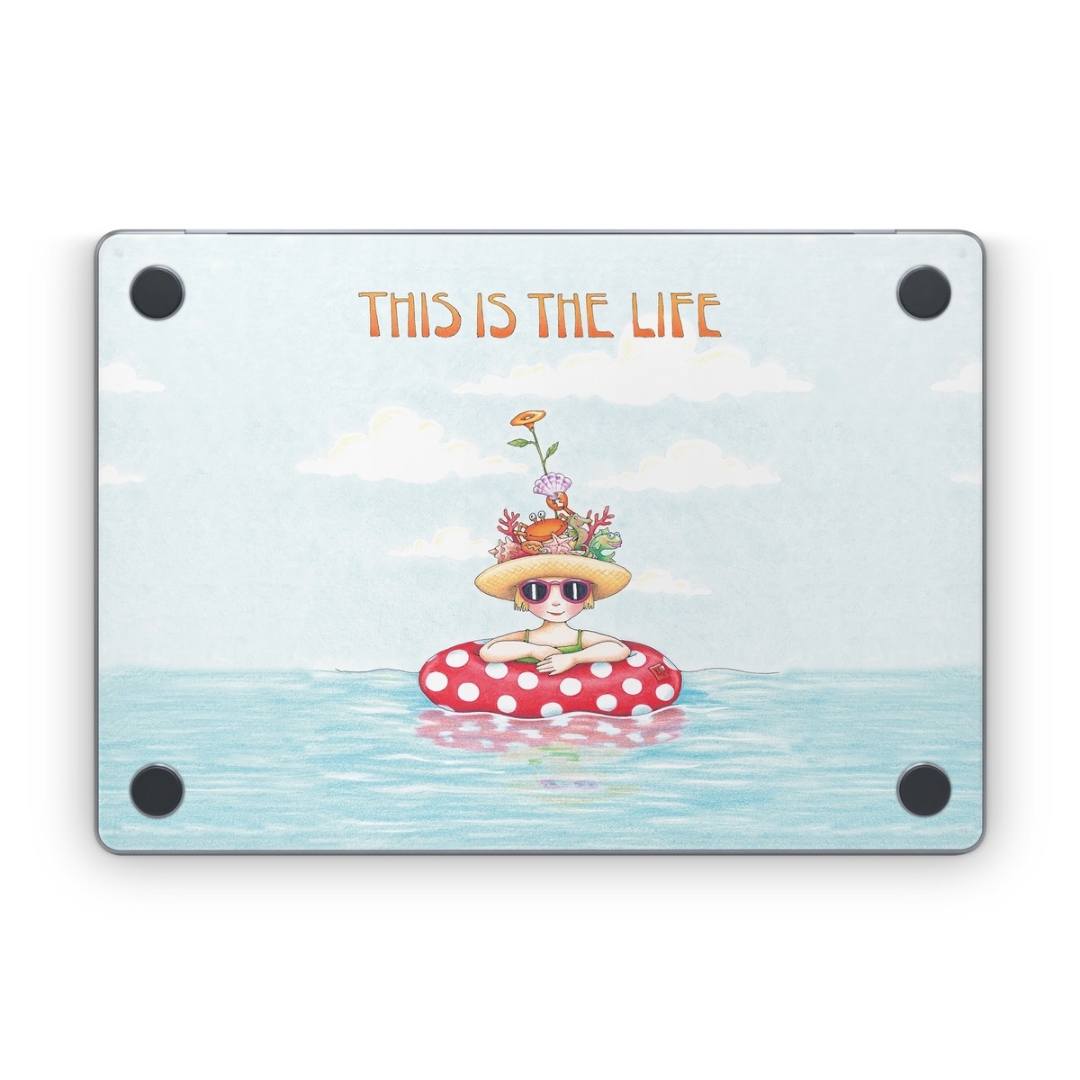 iStyles Apple MacBook Skin design of Cartoon, Illustration, Clip art, with blue, red, white, yellow, green, orange, pink colors, and tagged with signs, flowers, people, objects, animals, beach, crab, funny, humor, ocean, sea, water, waves.