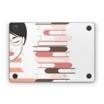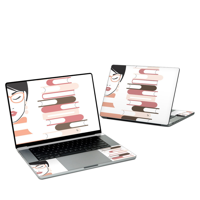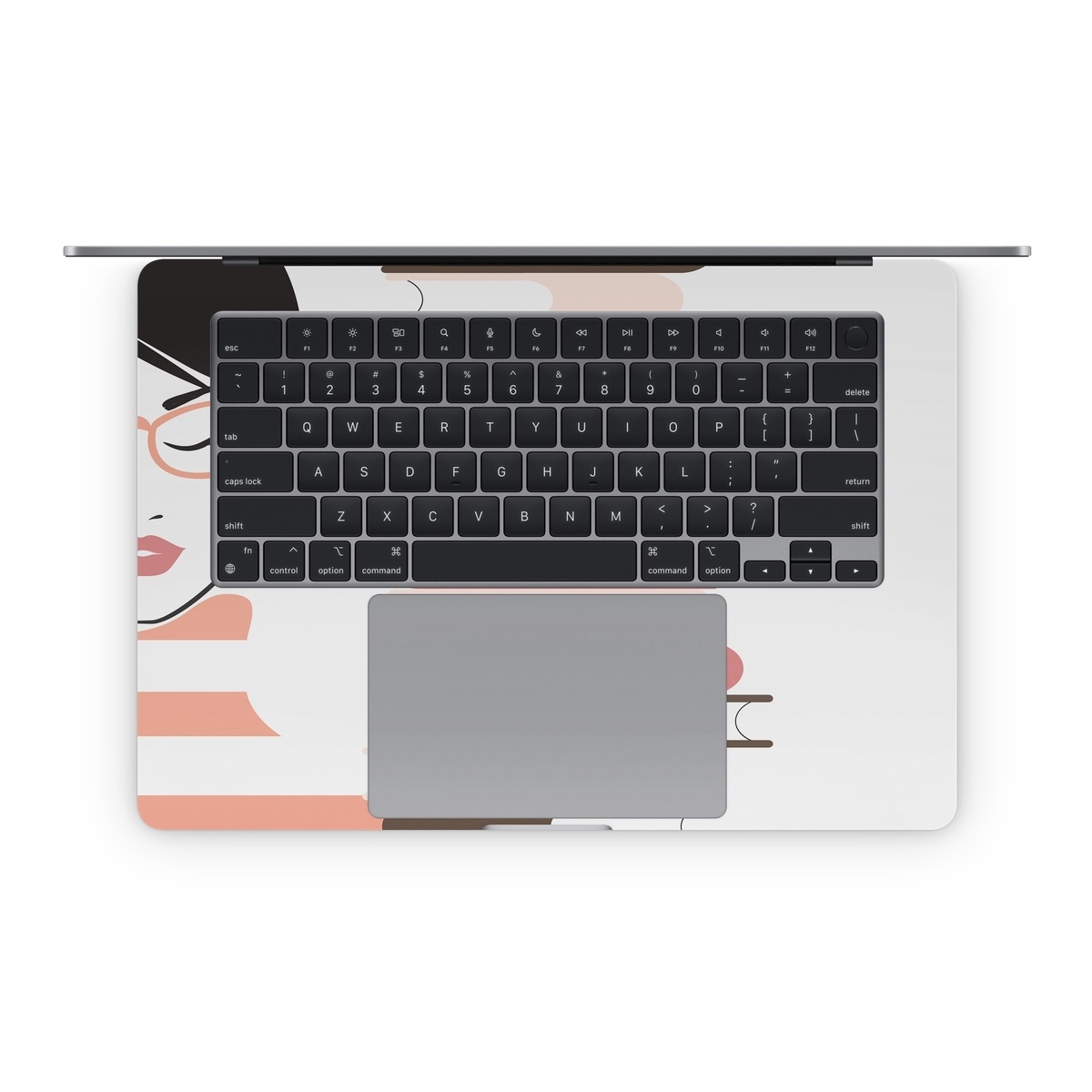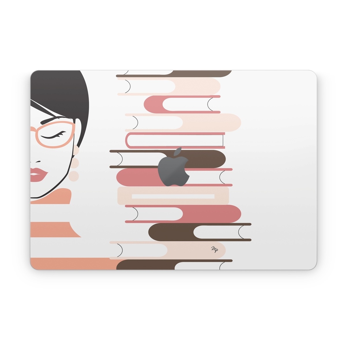 iStyles Apple MacBook Skin design of Eyebrow, Gesture, Font, Carmine, Graphics, Thumb, Art, Illustration, Graphic design, Lipstick, with white, black, pink, brown, red colors, and tagged with objects, people, patterns, reading, girl, spectacles.
