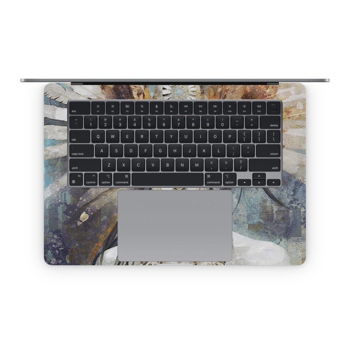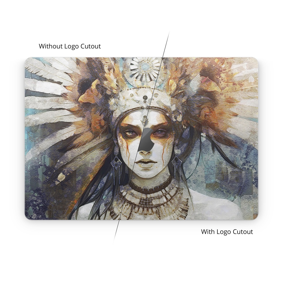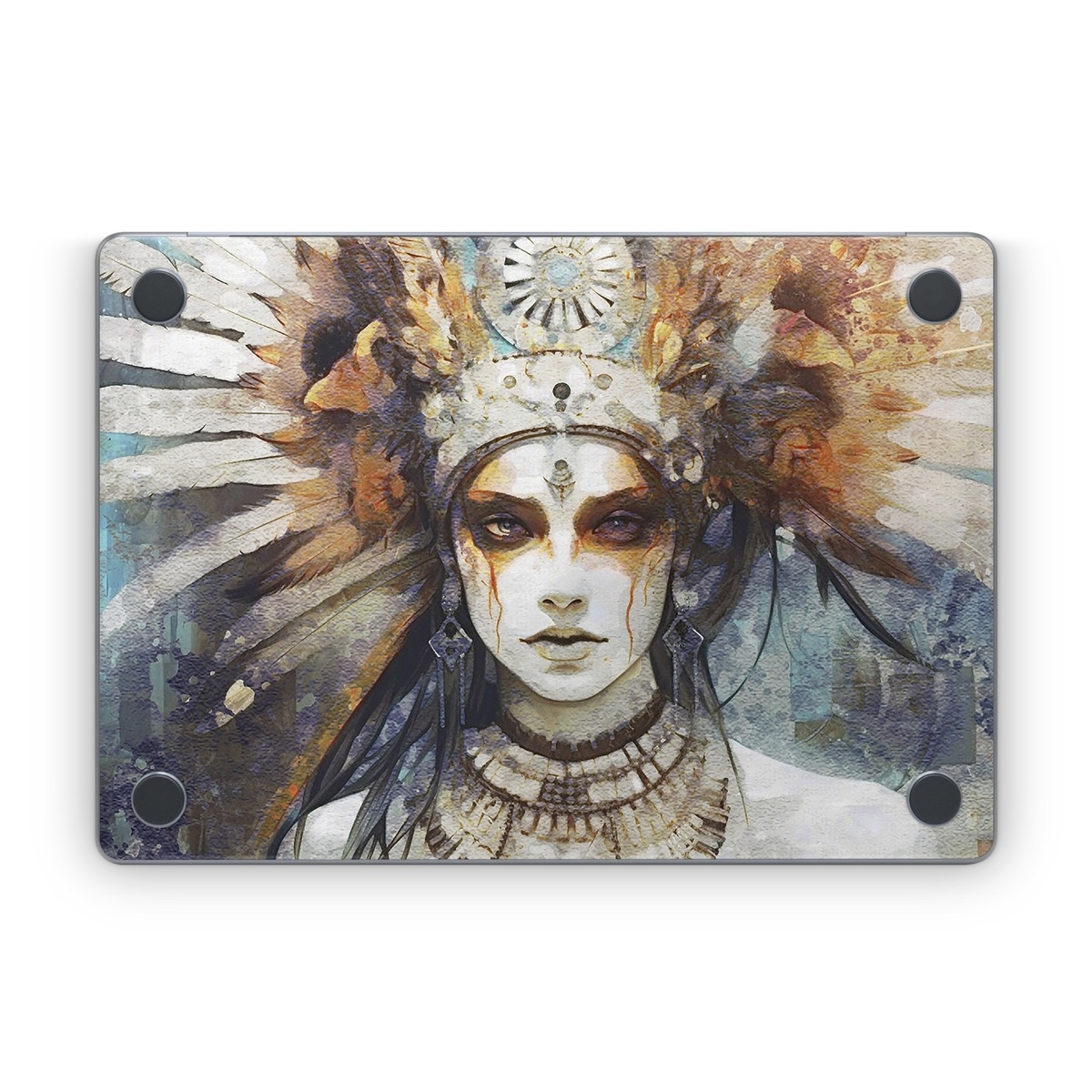 iStyles Apple MacBook Skin design of Eye, Paint, Eyelash, Painting, Art, Headpiece, Beauty, Feather, Illustration, Mask, with white, black, yellow, brown, gray, blue colors, and tagged with flowers, people, woman, .