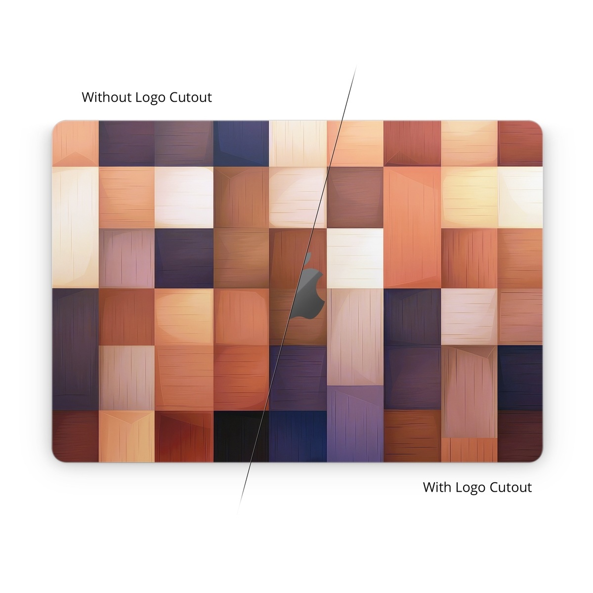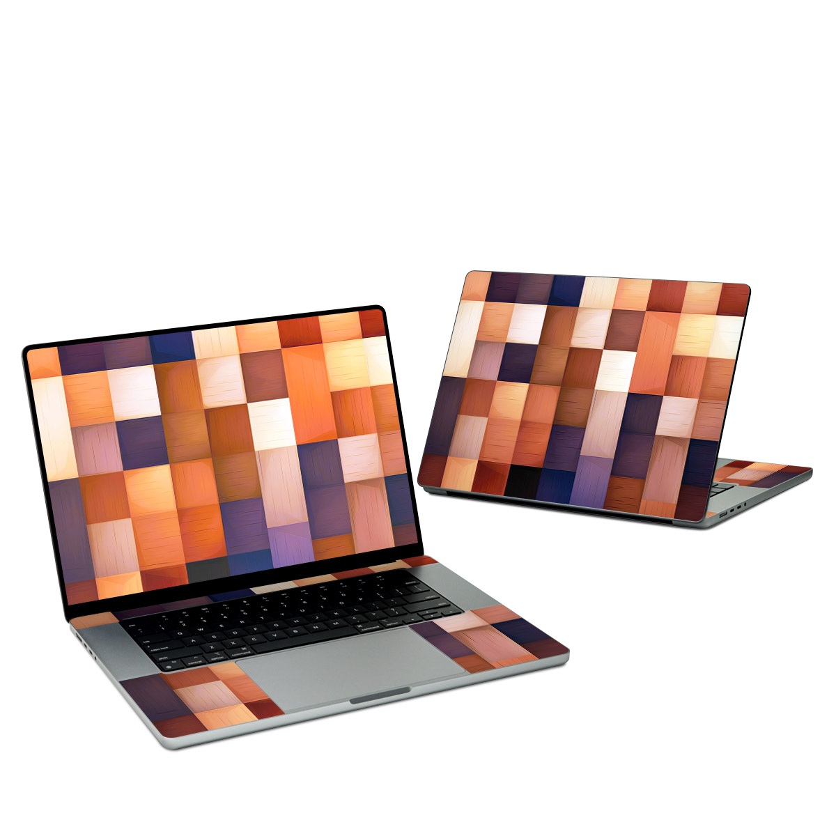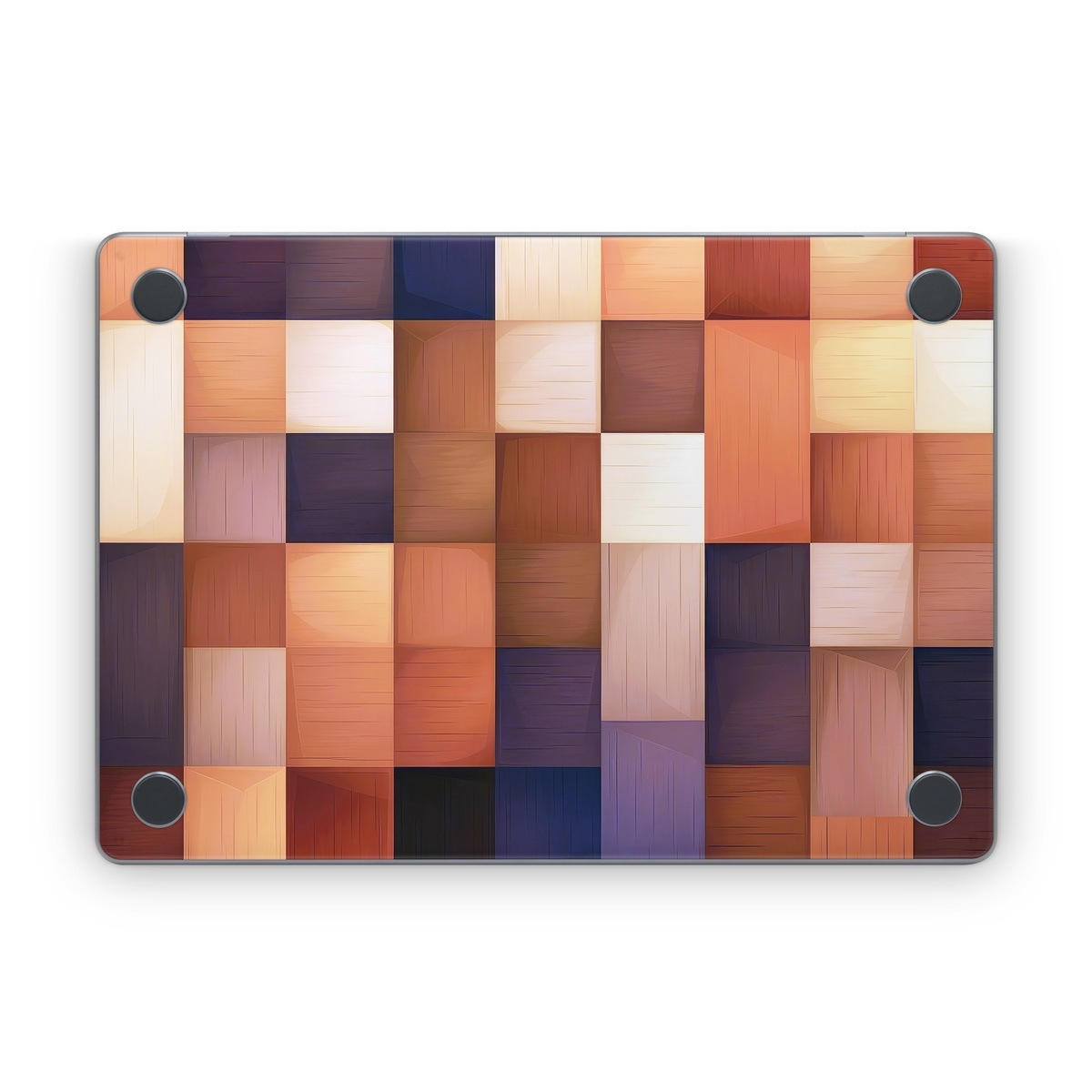 iStyles Apple MacBook Skin design of Brown, Light, Rectangle, Product, Wood, Blue, Orange, Amber, Textile, Wood stain, with yellow, orange, red, black, brown, blue, purple colors, and tagged with patterns, autumn, fall, pattern, squares.