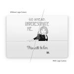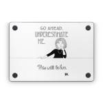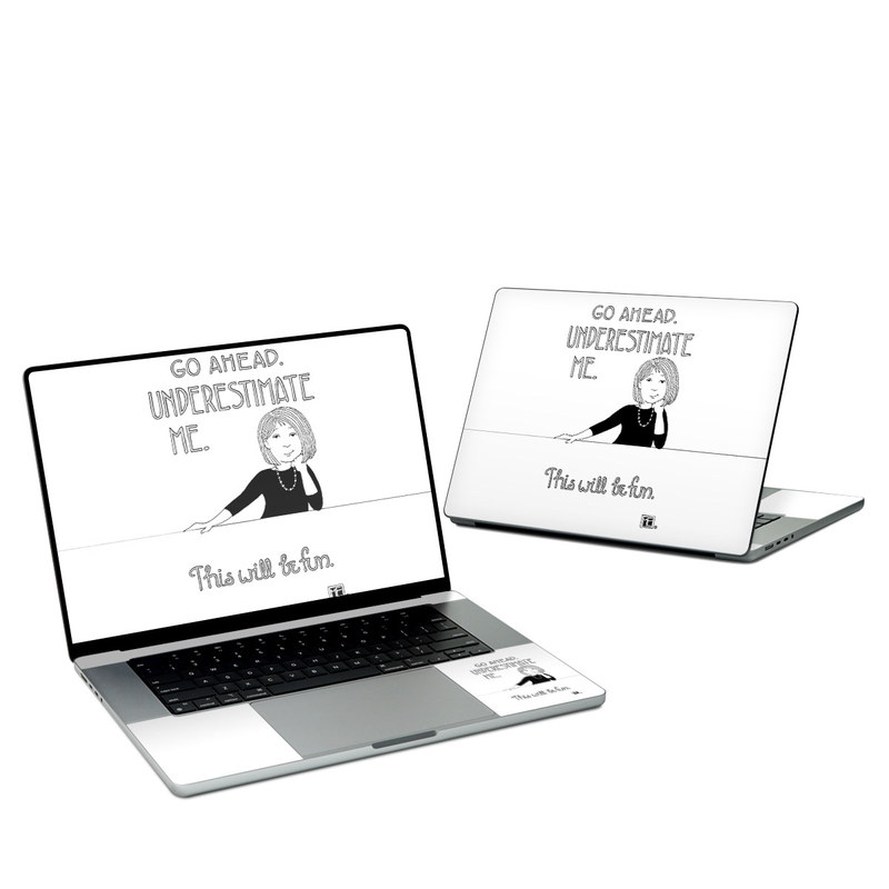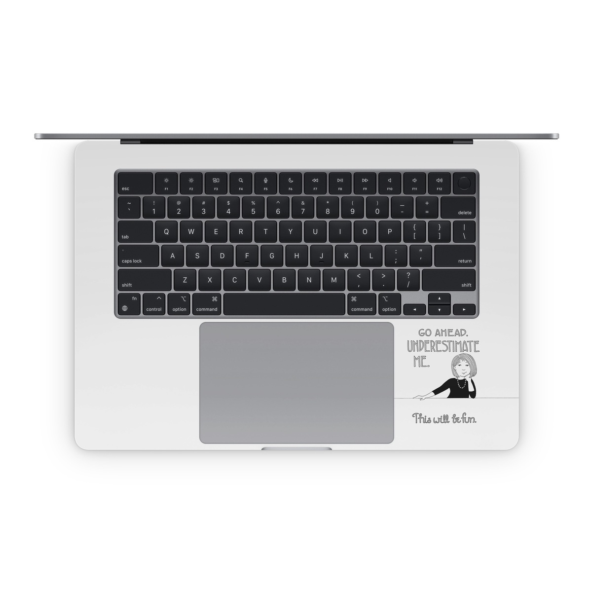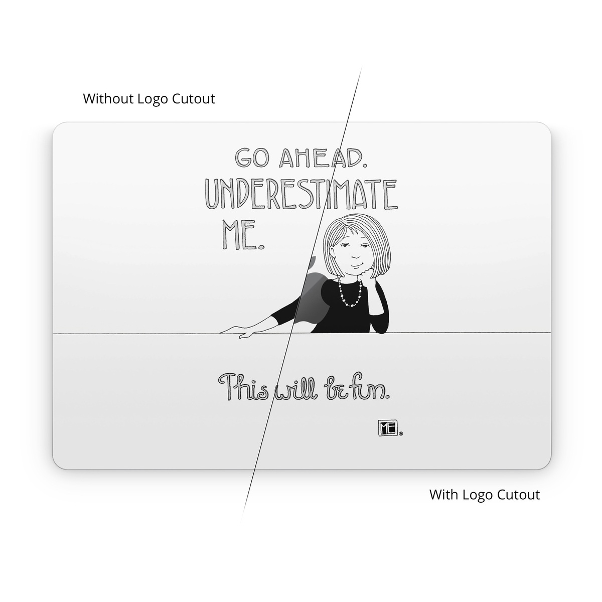 iStyles Apple MacBook Skin design of Gesture, Happy, Font, Illustration, Poster, Line art, Graphics, Art, Logo, Graphic design, with black, white colors, and tagged with signs, people, confidence, attitude, go, ahead, underestimate, me, this, will, be, fun.