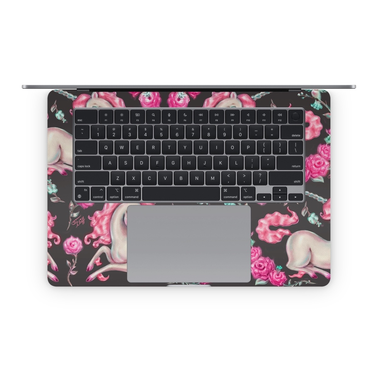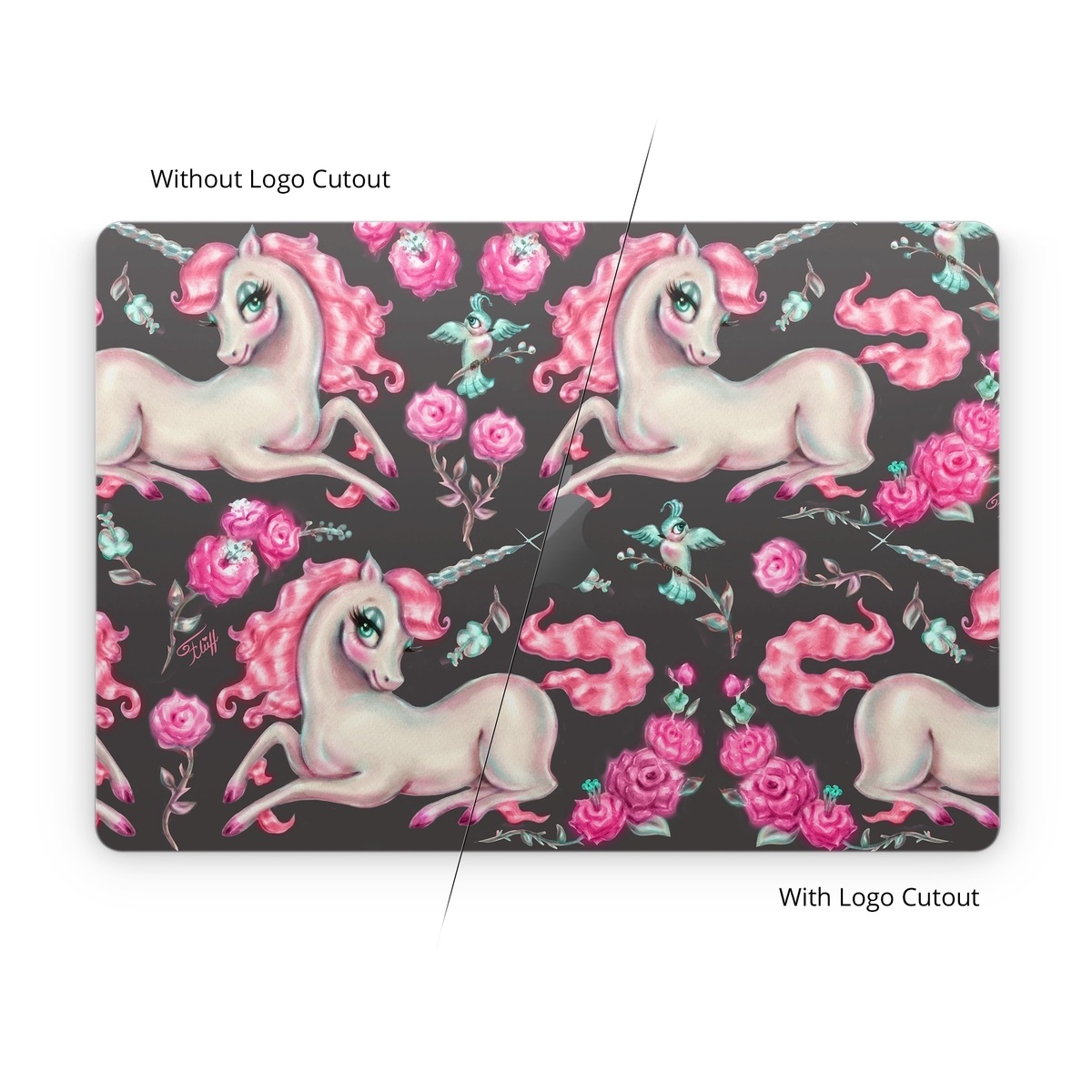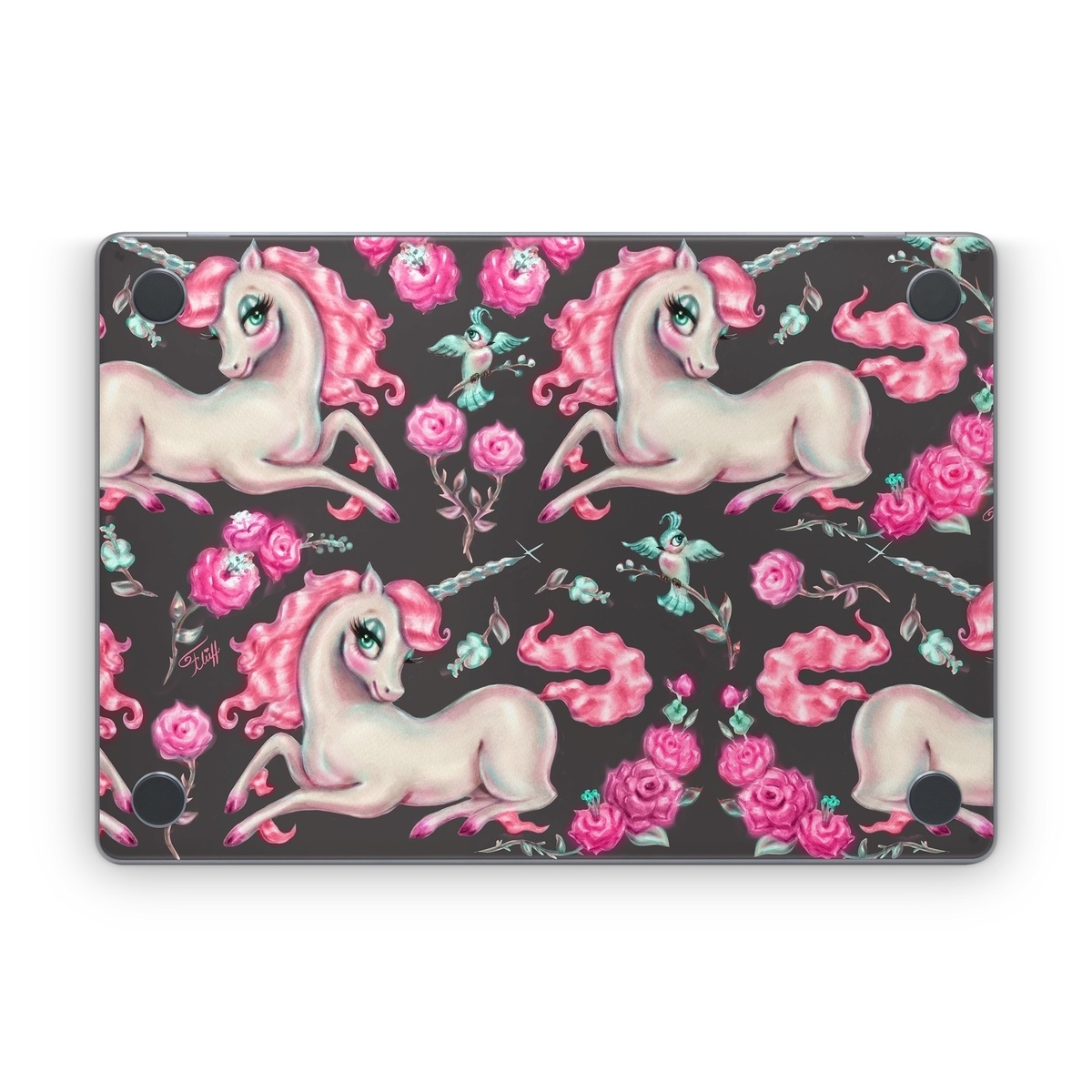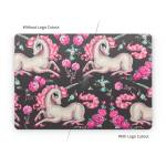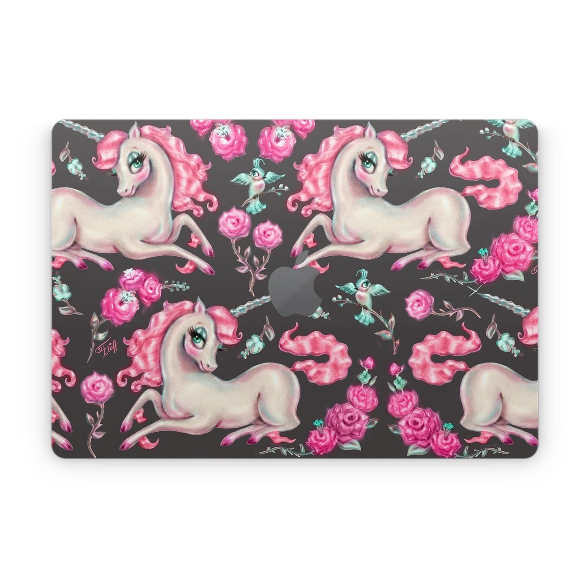 iStyles Apple MacBook Skin design of Pink, Horse, Pony, Fictional character, Unicorn, Mythical creature, Mane, Textile, Animal figure, Illustration, with white, pink, blue, black, red colors, and tagged with patterns, animals, flowers, fantasy, flower, flowers, magic, magical, pink, rose, roses, unicorn, unicorns.