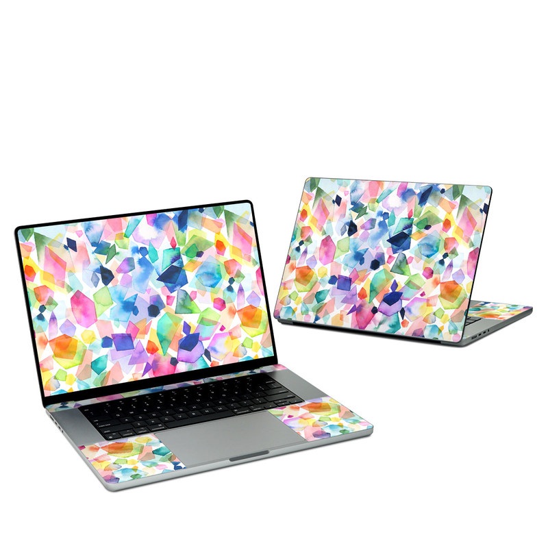 iStyles Apple MacBook Skin design of Colorfulness, Azure, Triangle, Art, Font, Line, Aqua, Material property, Creative arts, Symmetry, with white, blue, green, red, pink, orange, yellow, purple colors, and tagged with patterns, objects, blue, crystals, gems, geometric, green, orange, pink, purple, rocks, shapes.