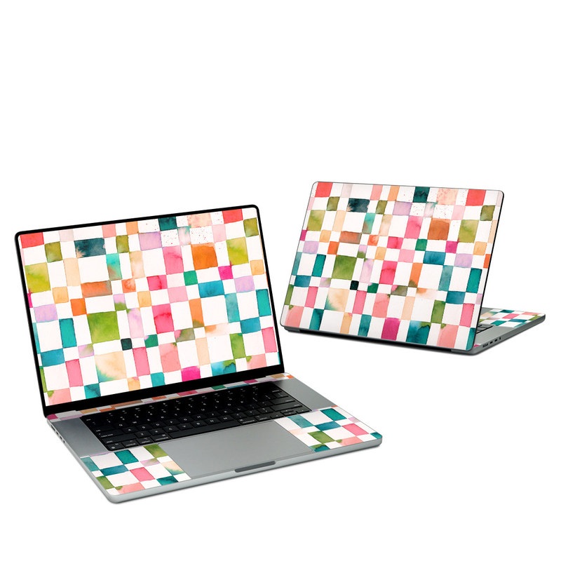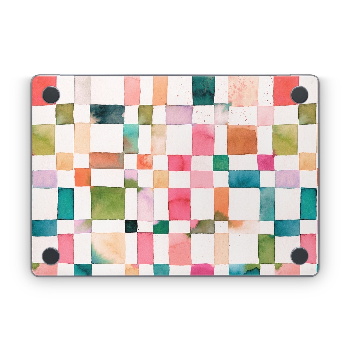 iStyles Apple MacBook Skin design of Brown, Rectangle, Product, Textile, Art, Pink, Line, Aqua, Magenta, Symmetry, with white, pink, green, red, blue, orange, purple colors, and tagged with patterns, checkers, geometric, pattern, shapes, squares, watercolor.