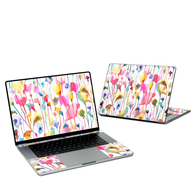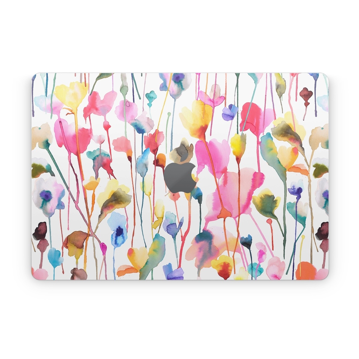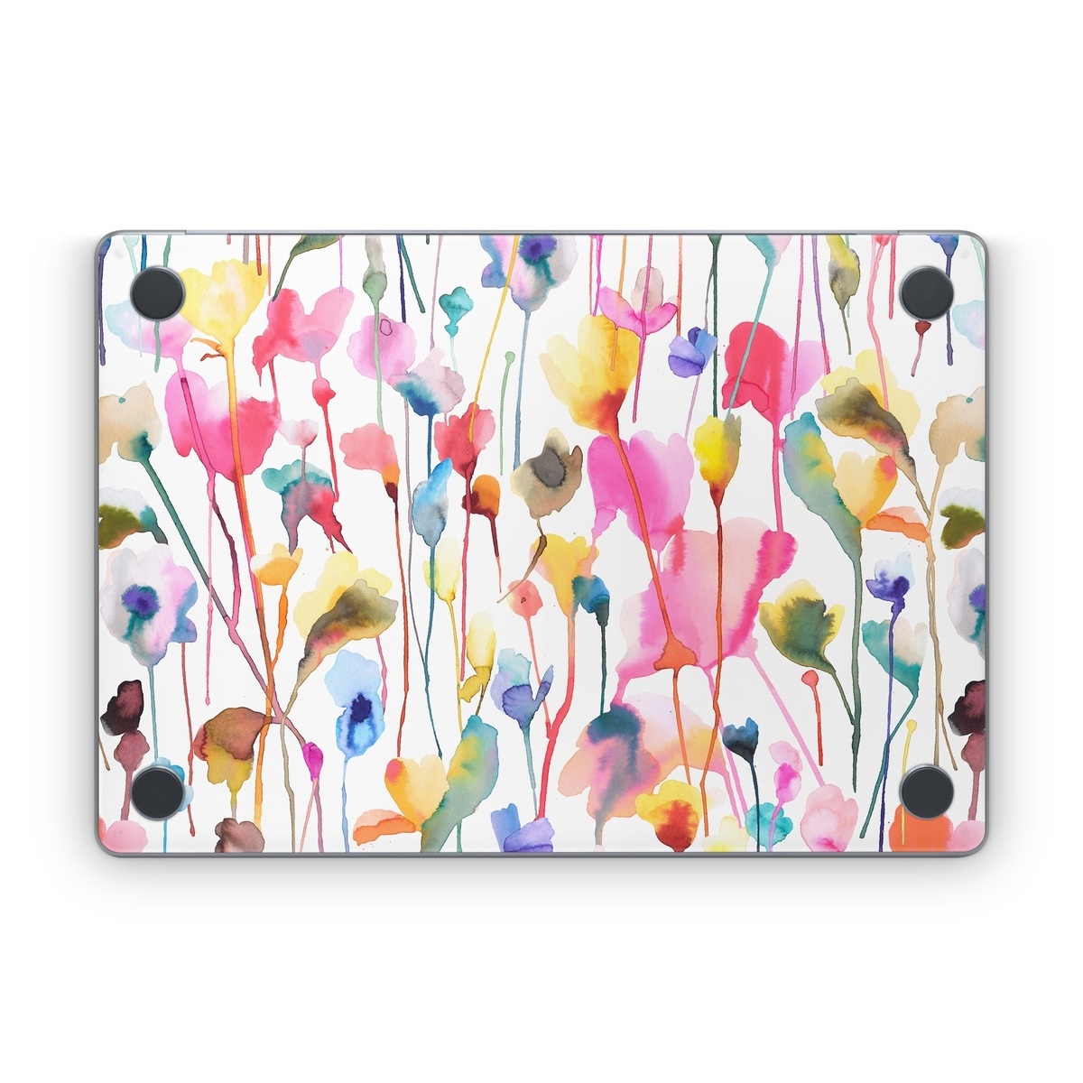 iStyles Apple MacBook Skin design of Plant, Petal, Art, Font, Pattern, Automotive wheel system, Event, Visual arts, Party supply, Pole, with white, red, pink, yellow, orange, green, blue, purple colors, and tagged with patterns, flowers, color, colorful, flower, flowers, pattern, rainbow, watercolor.