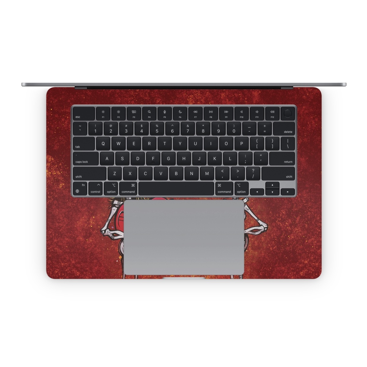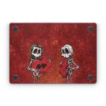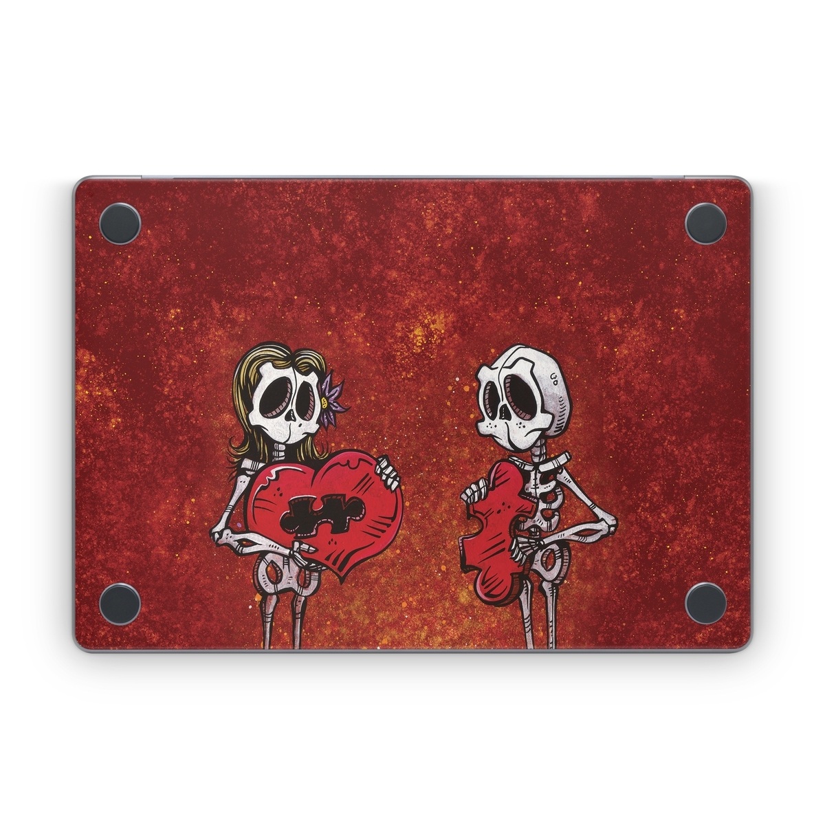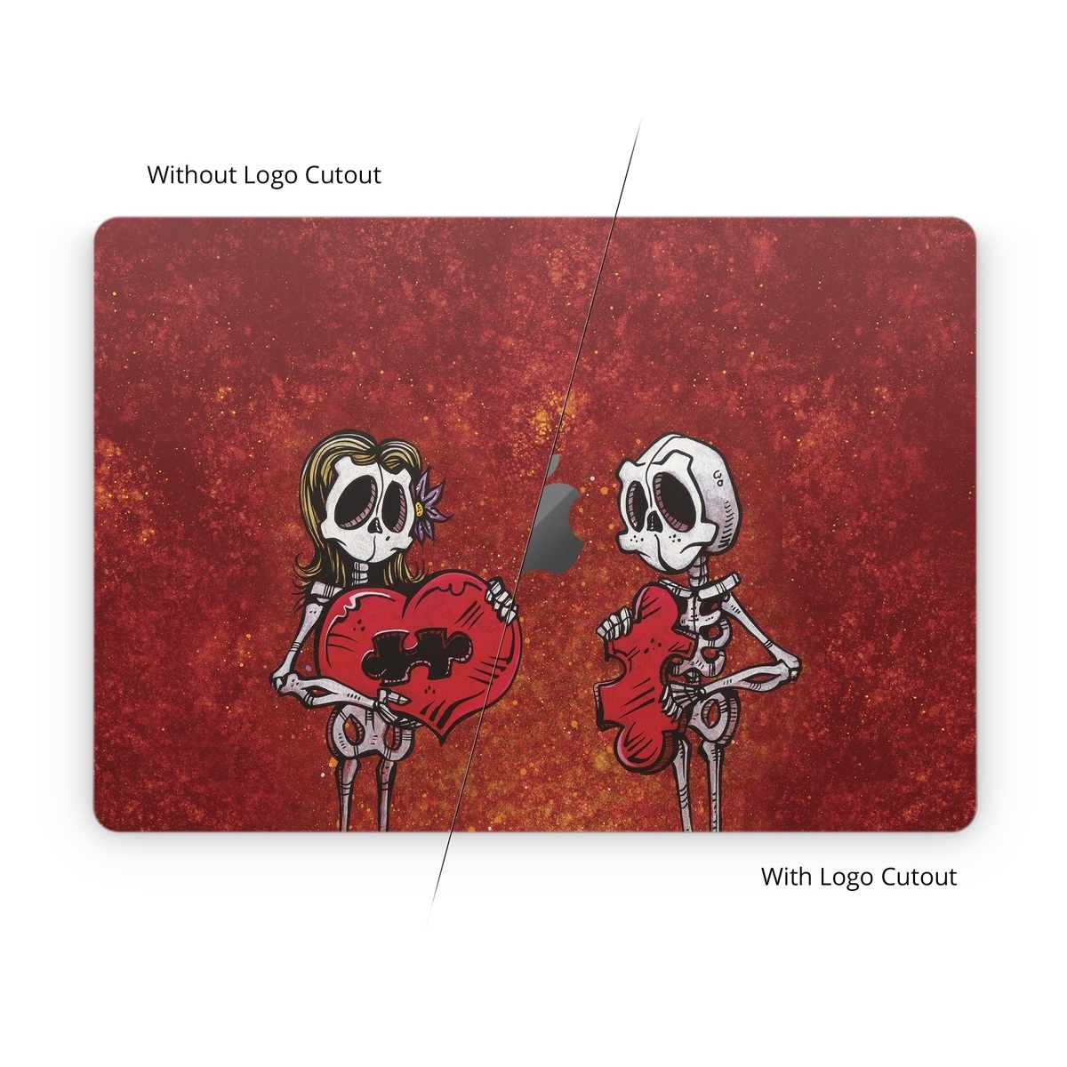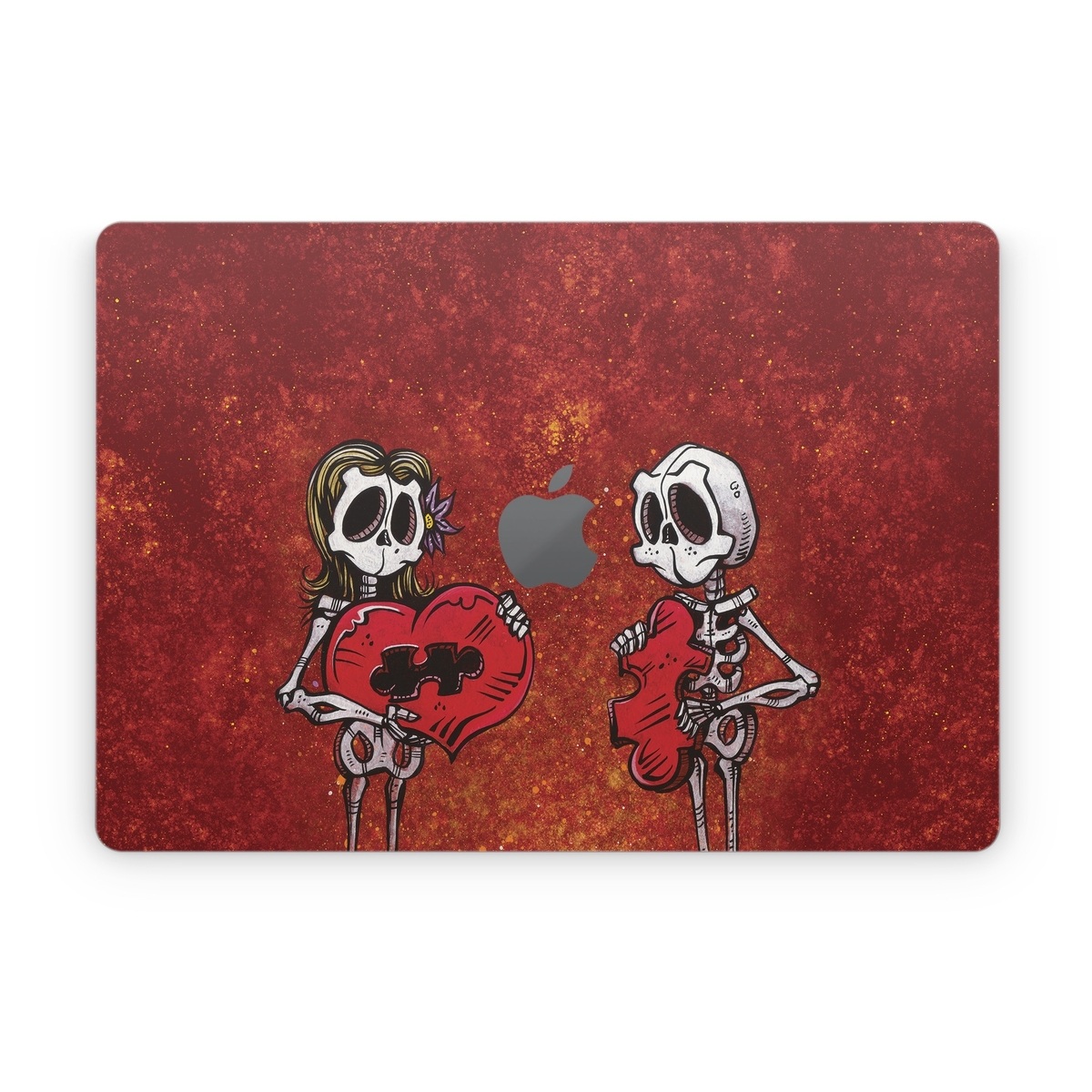 iStyles Apple MacBook Skin design of Font, Tints and shades, Bone, Art, Skull, Pattern, Creative arts, Carmine, Visual arts, Rectangle, with white, black, gray, brown, red, yellow, orange colors, and tagged with skulls, hearts, love, couple, perfect.