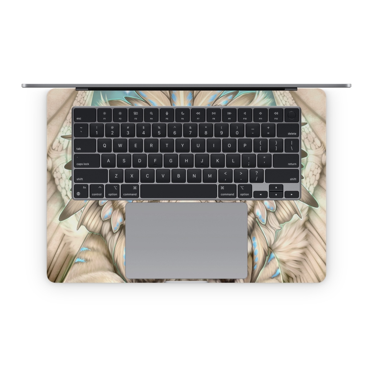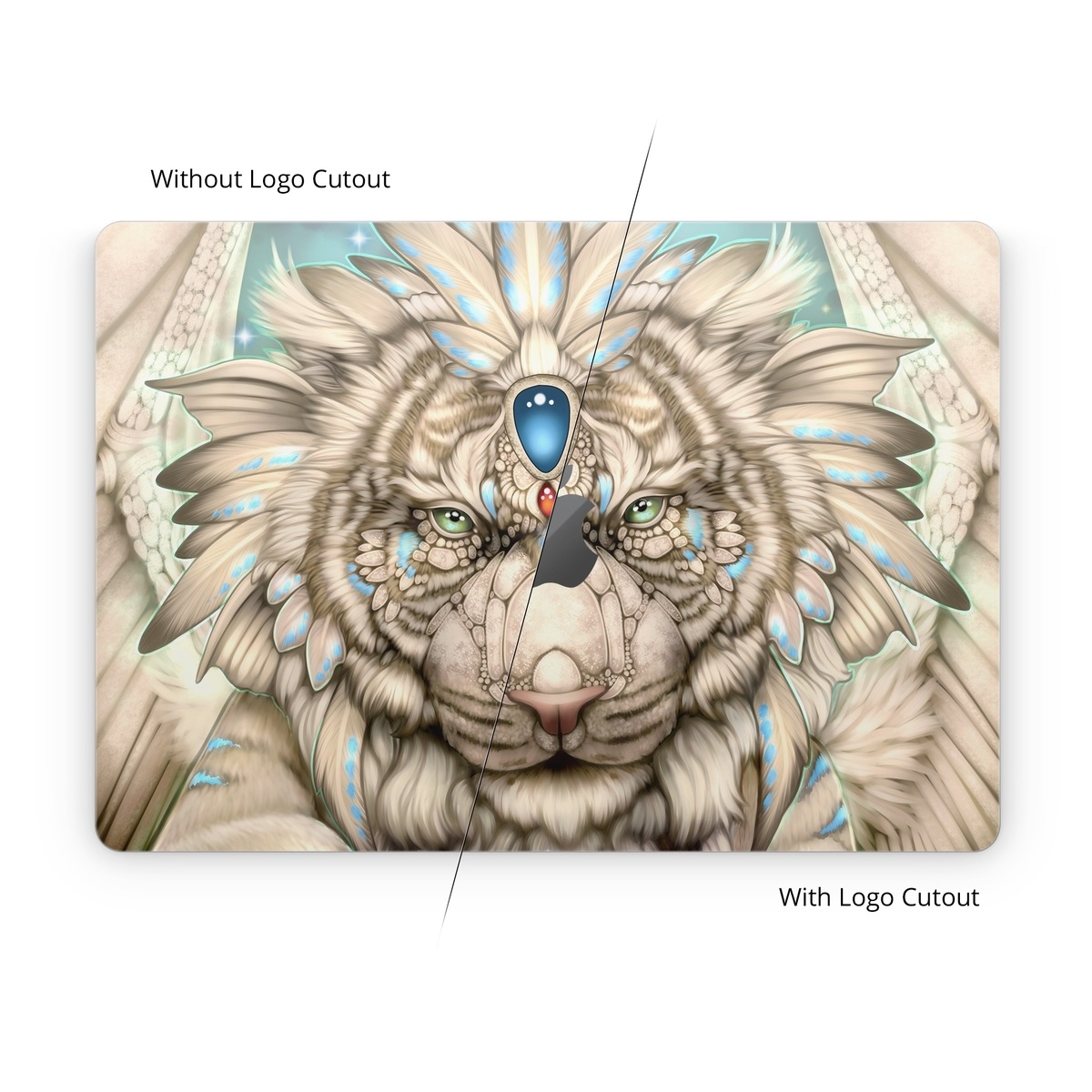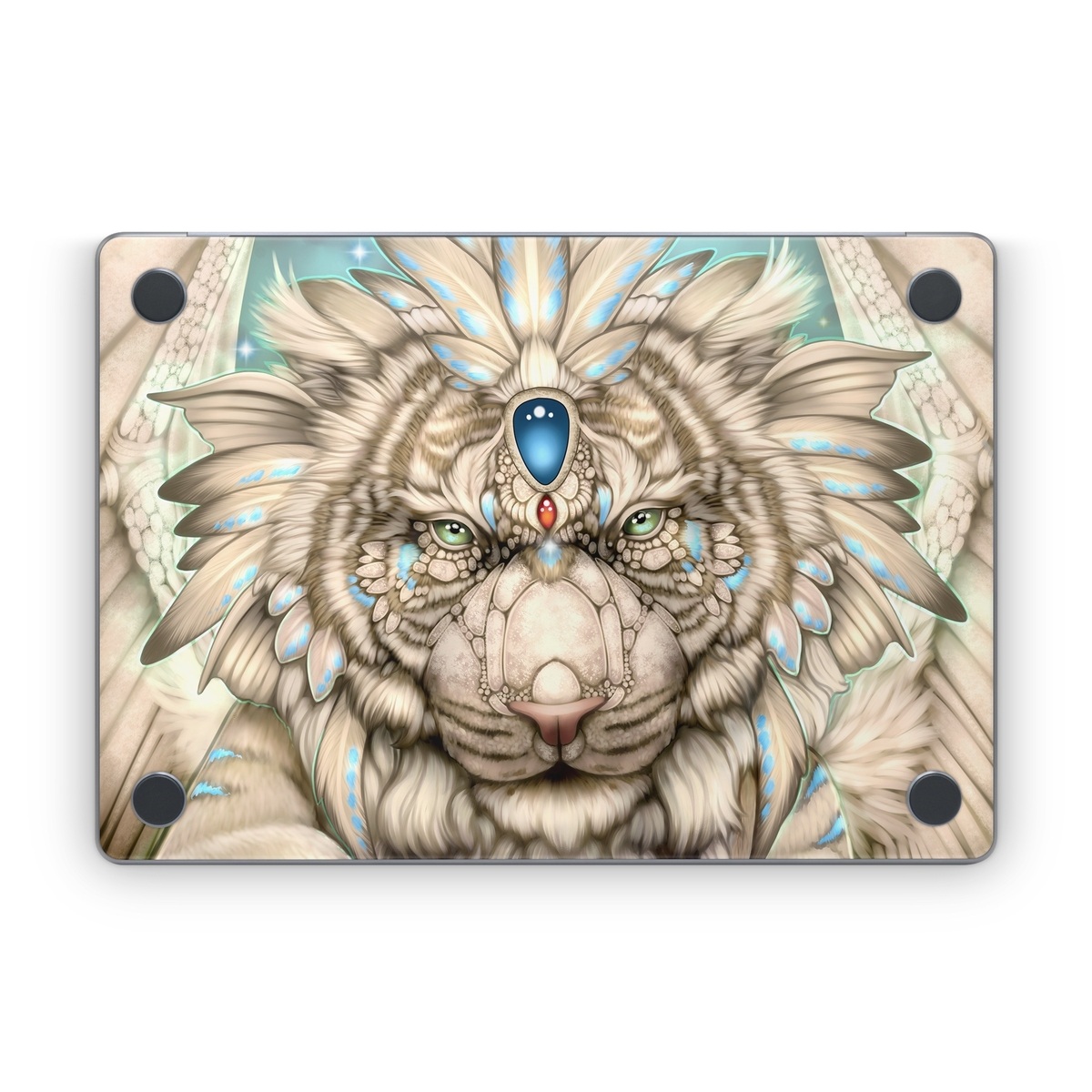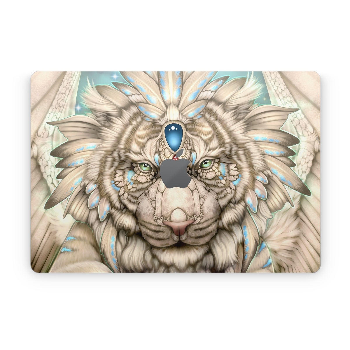 iStyles Apple MacBook Skin design of Mythical creature, Sleeve, Textile, Gesture, Felidae, Tattoo, Big cats, Font, Temporary tattoo, Painting, with white, blue, black, gray colors, and tagged with fantasy, animals, objects, white, tiger, wings.