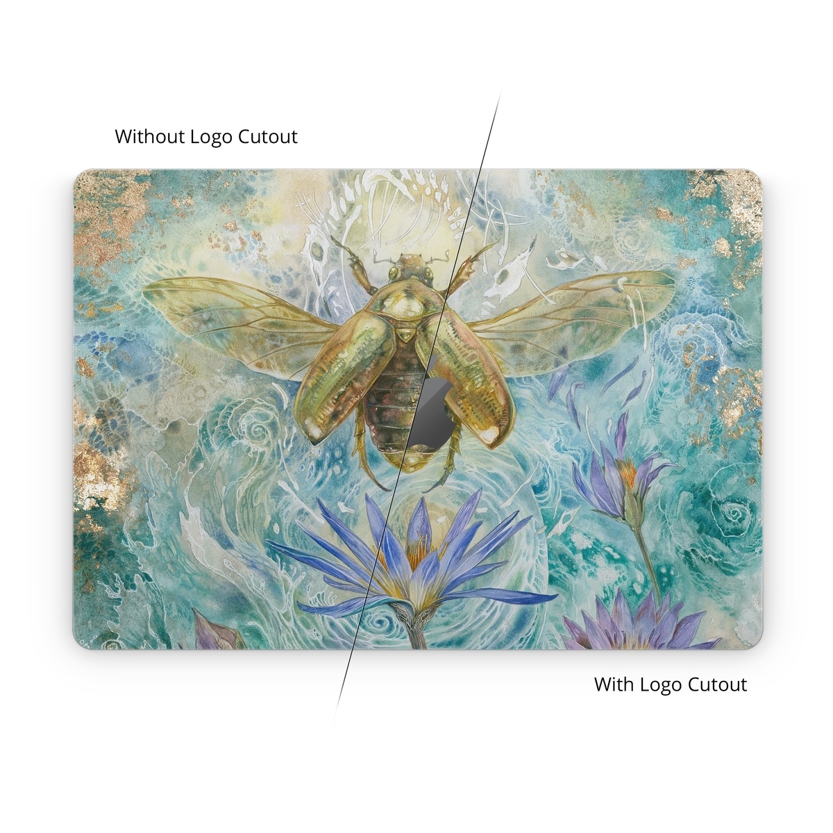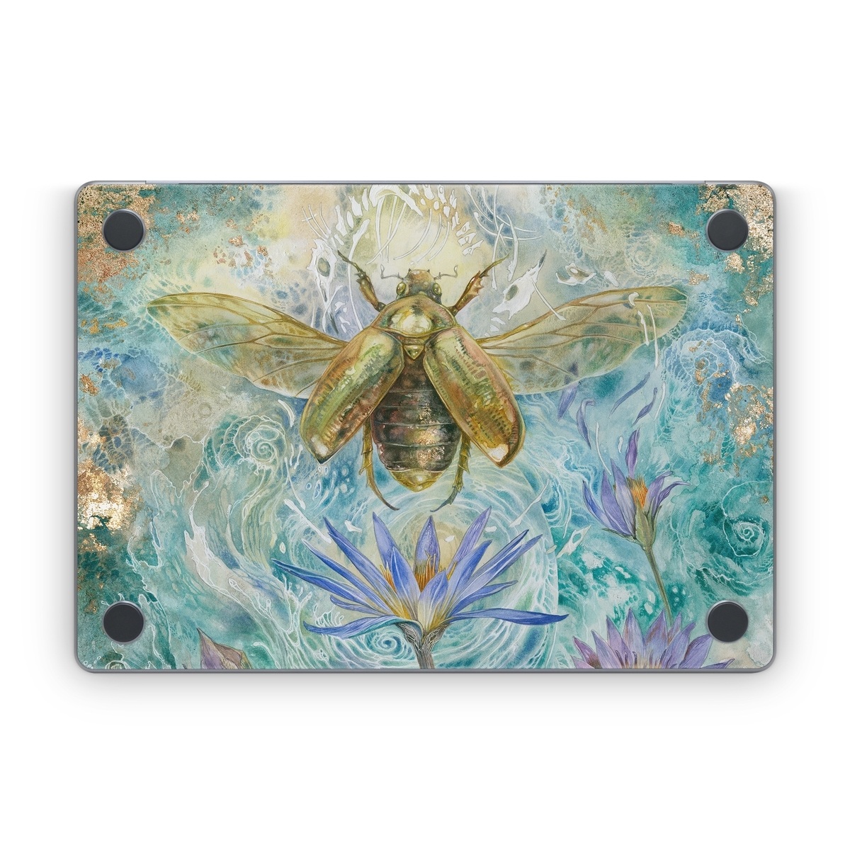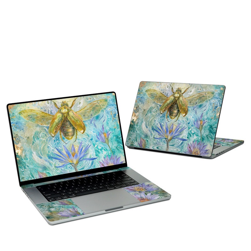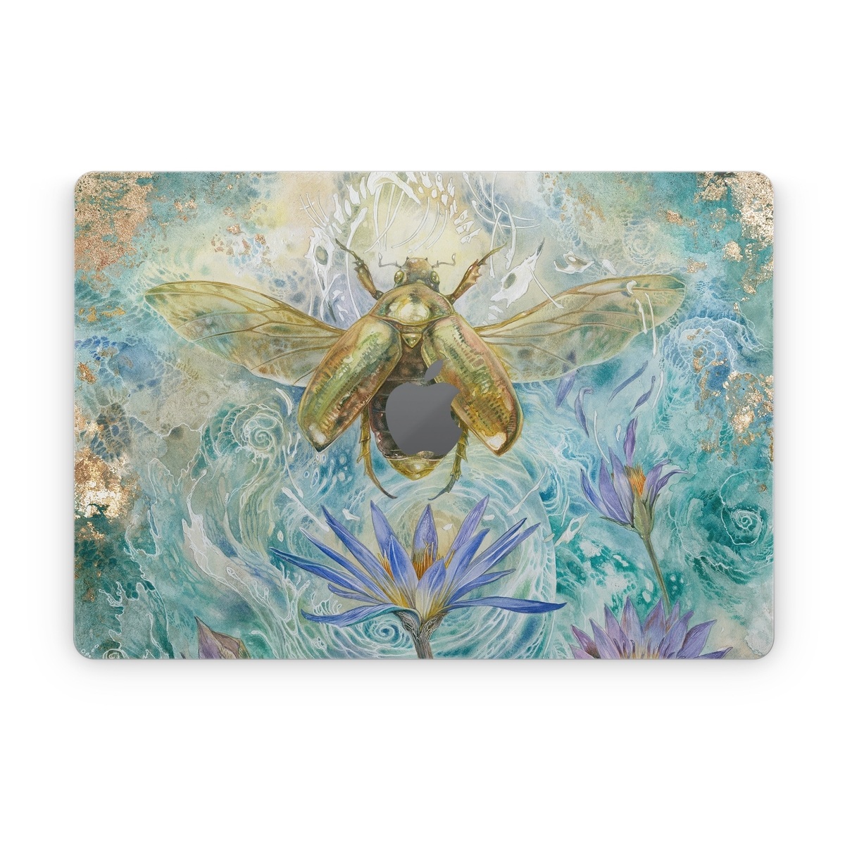 iStyles Apple MacBook Skin design of Painting, Fictional character, Art, Flower, Watercolor paint, Plant, Wildflower, Angel, Honeybee, Mythology, with blue, yellow, brown, purple, red, white colors, and tagged with animals, nature, flowers, bug, bugs, flowers, insects, water.