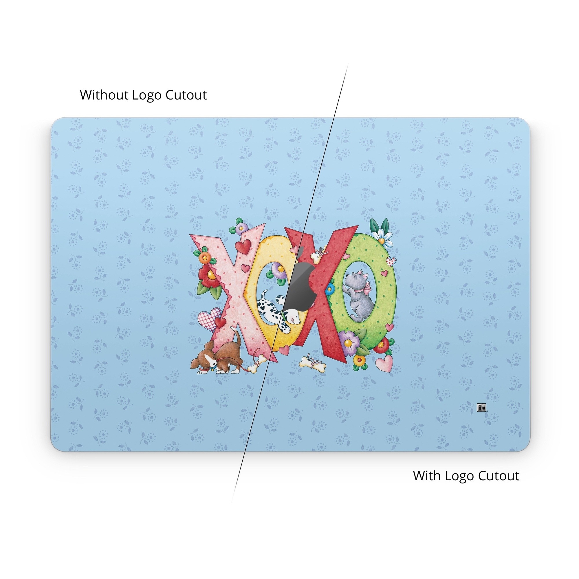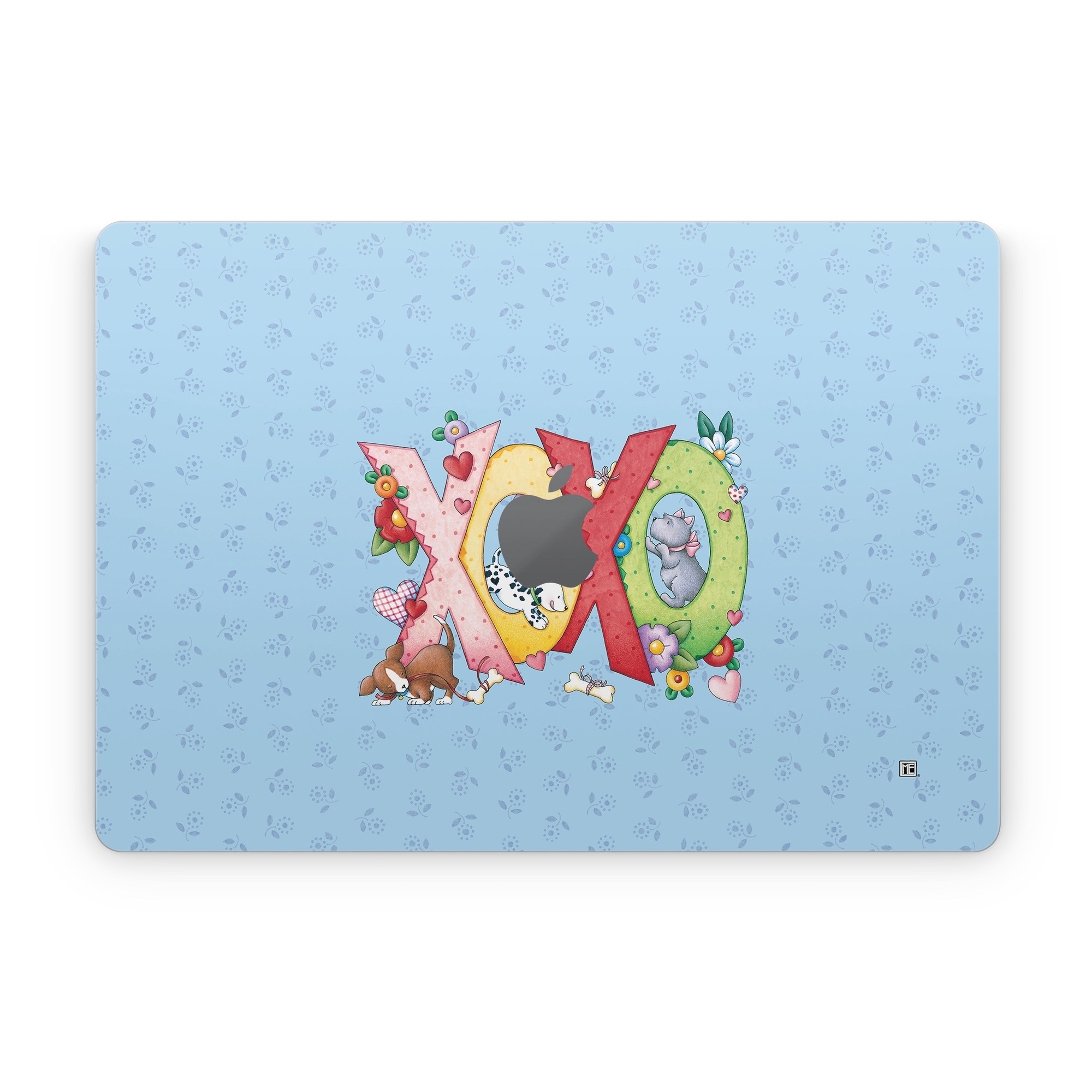 iStyles Apple MacBook Skin design of Rectangle, Font, Creative arts, Art, Pattern, Happy, Illustration, Circle, Graphics, Visual arts, with blue, pink, yellow, red, green, orange, brown, white, black colors, and tagged with animals, signs, hearts, flowers, patterns, xoxo, love, valentine, puppies, dogs, dalmatians, hearts, flowers.