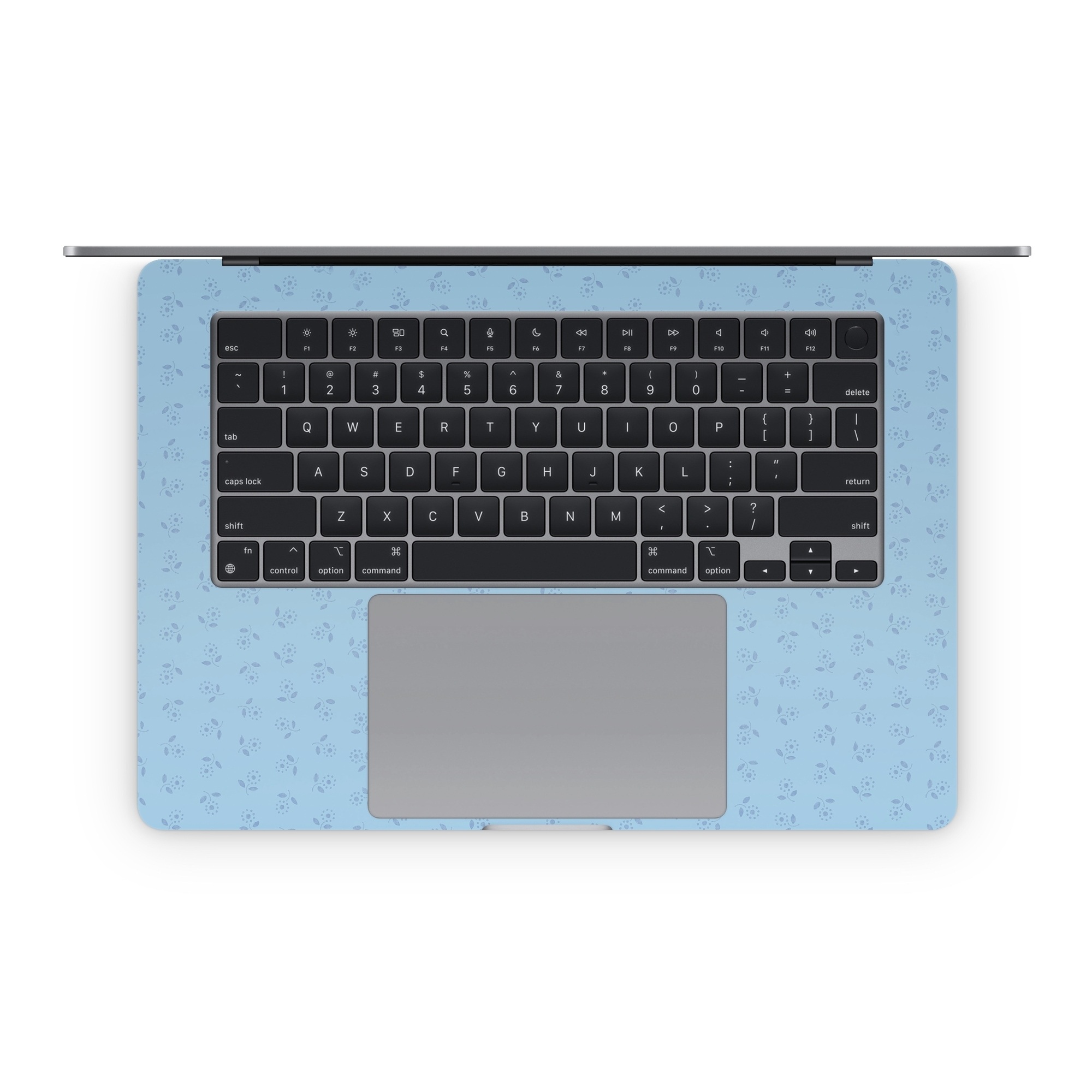 The MacBook inner Skins are precision cut to cover the area around the keyboard - the complexity and large size of this surface does make Skin alignment a little more tricky but the final effect when it's done properly is well worth the effort. What we generally do during Skin application is to first align the Skin to the major physical cutouts, and in this case, that will be the trackpad area. Peel the whole inner Skin off and start with the bottom half; hold the Skin at both ends of the wrist rest area and gently position until it aligns perfectly to the trackpad. One trick will be to keep the top half (the thin stripes that go beside the keyboard) folded back over the bottom half such that the stripes do not get stuck on your MacBook when you're positioning the bottom half. Once you've aligned the trackpad, everything else will fall in place with a little guidance.