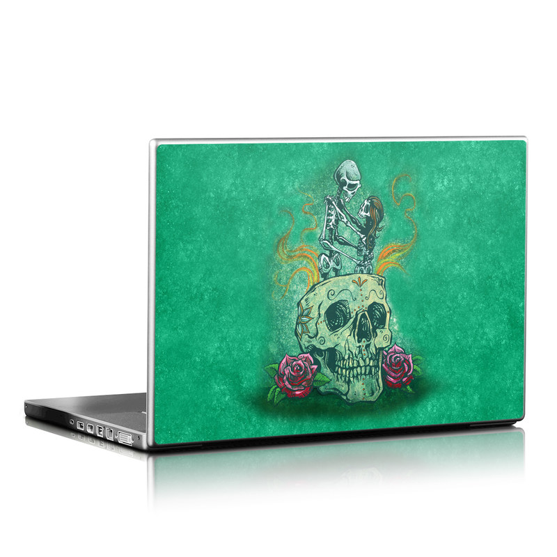 iStyles Universal Fit Laptop Skin design of Bone, Skull, Aqua, Pattern, Electric blue, Fashion accessory, Font, Fictional character, Art, Grass, with green, pink, red, yellow, orange, white, gray colors, and tagged with skulls, flowers, flames, couple, eternal, love, flames, roses.