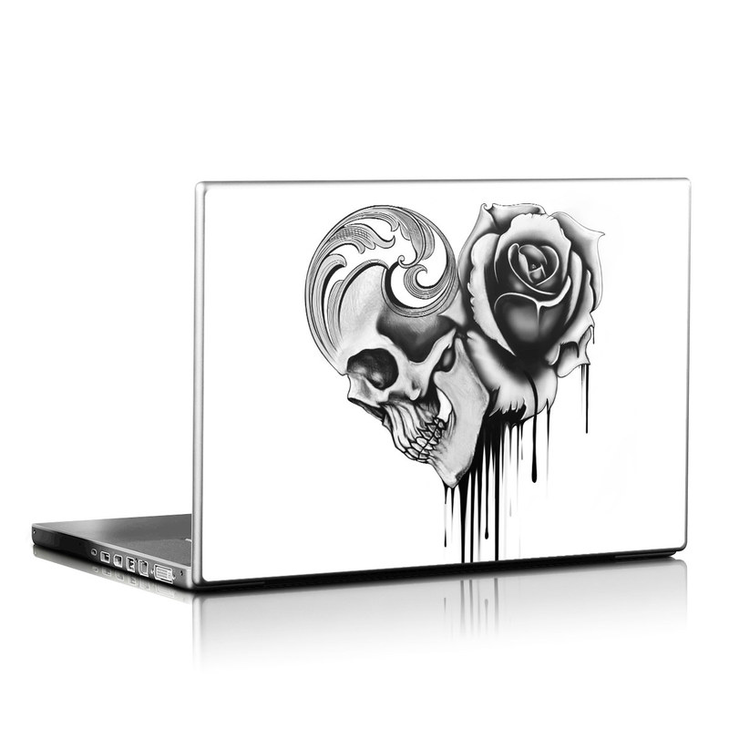 iStyles Universal Fit Laptop Skin design of Black-and-white, Illustration, Monochrome, Rose, Plant, Style, Metal, Drawing, with white, black, gray colors, and tagged with hearts, flowers, skulls, goth, gothic, heart, ink, inkpen, rose, sketch, skull.