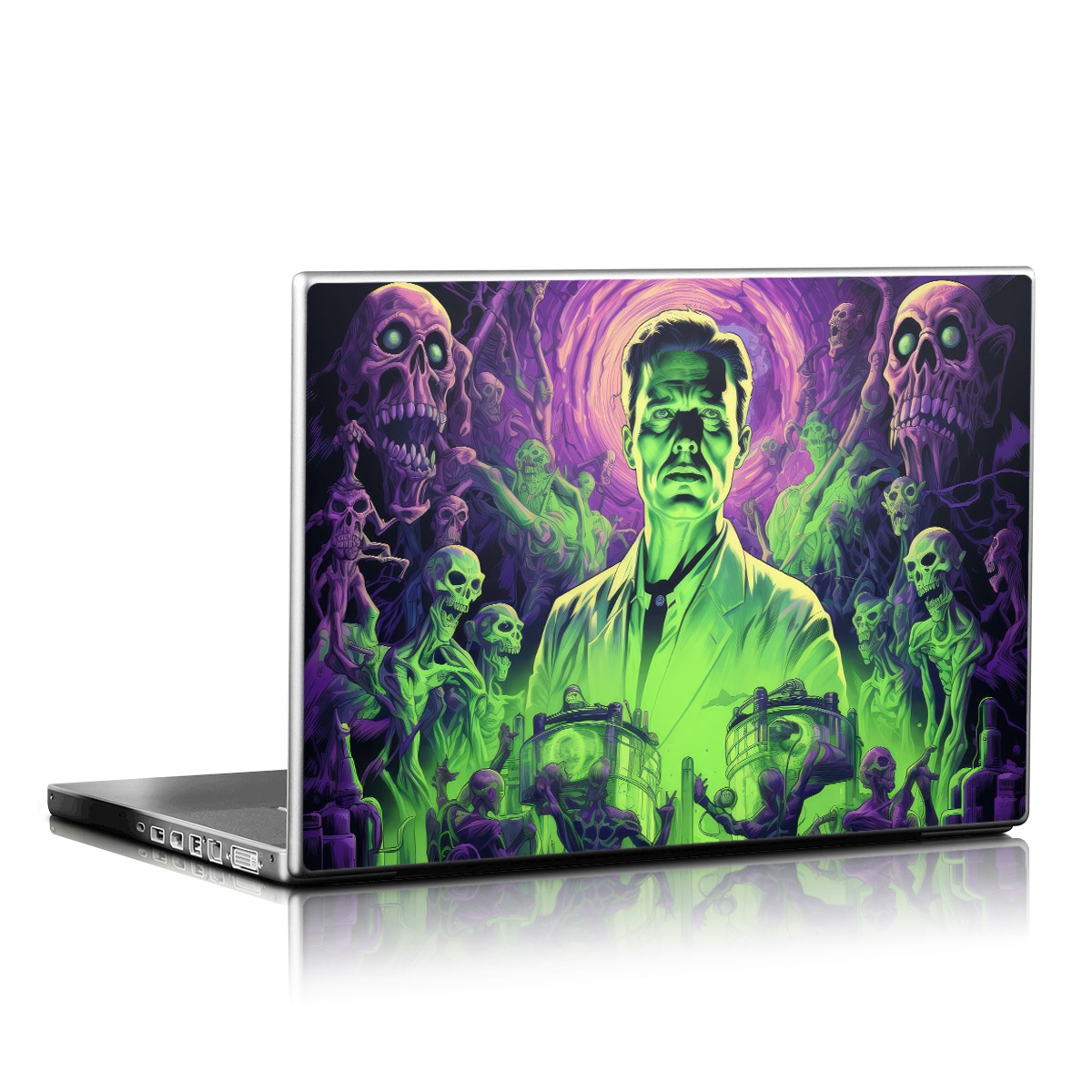 iStyles Universal Fit Laptop Skin design of Art, Cool, Fictional character, Illustration, Painting, Electric blue, Visual arts, Artist, Event, Drawing, with black, green, purple colors, and tagged with skulls, people, animals, halloween, zombie, scary.