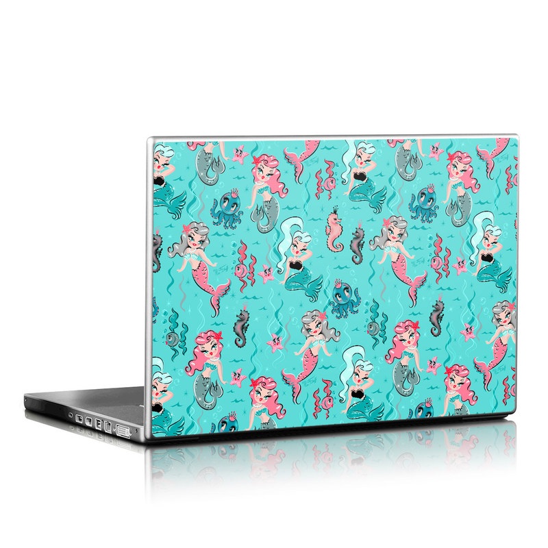 iStyles Universal Fit Laptop Skin design of Turquoise, Wrapping paper, Cartoon, Pattern, Textile, Aqua, Design, Gift wrapping, Illustration, Fictional character, with blue, pink, yellow, gray colors, and tagged with patterns, animals, people, fantasy, mermaid, mermaids, mystical, ocean, pastel, pattern, pinup, pinupgirl, sea, sealife.