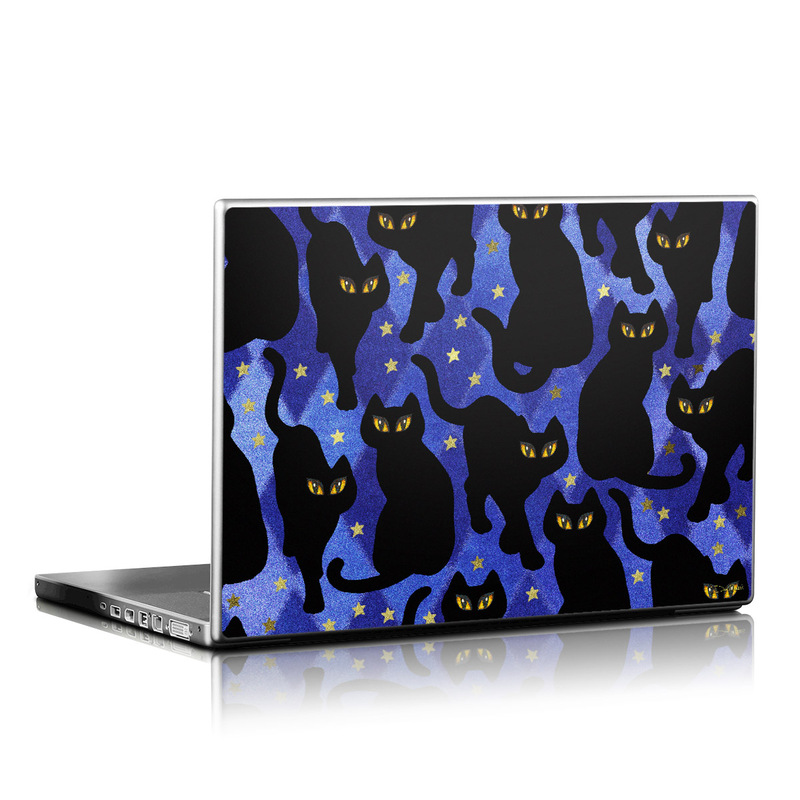 iStyles Universal Fit Laptop Skin design of Black cat, Black, Cat, Small to medium-sized cats, Pattern, Felidae, Design, Electric blue, Illustration, Art, with black, blue, purple, yellow colors, and tagged with patterns, animals.