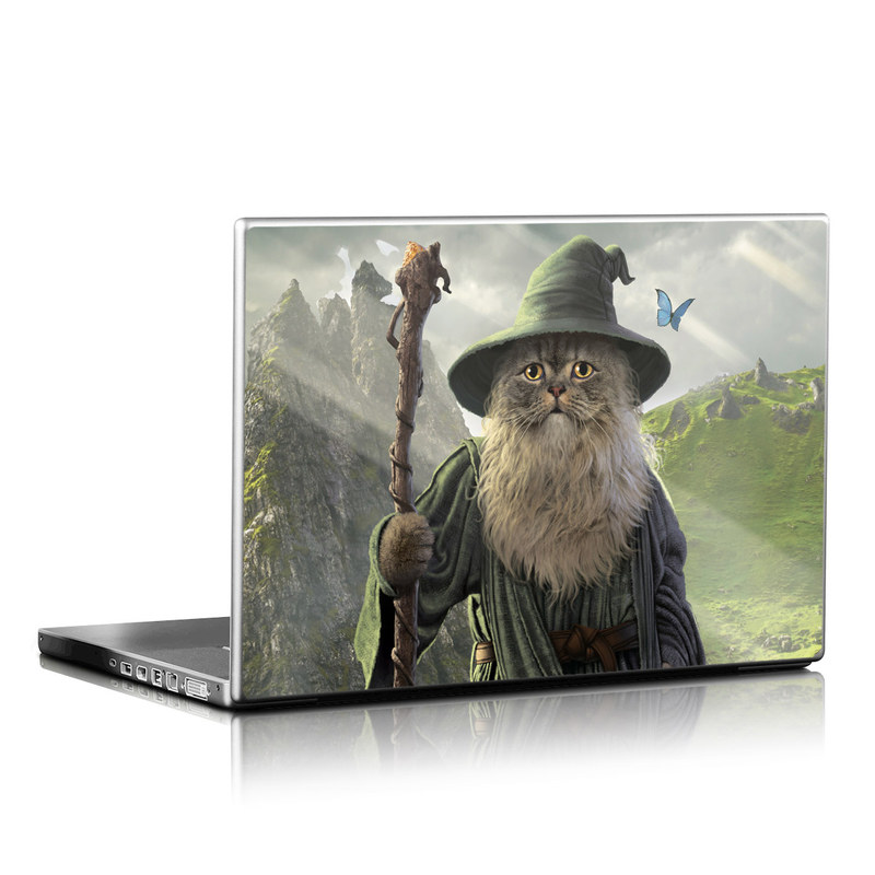 iStyles Universal Fit Laptop Skin design of Beard, Facial hair, Illustration, Mythology, Magician, Fictional character, Cg artwork, Games, Art, with green, gray, brown, blue, green, white, yellow, black colors, and tagged with animals, fantasy, objects, cat, fantasy, middleearth, movie, movies, wizard, hat, staff.