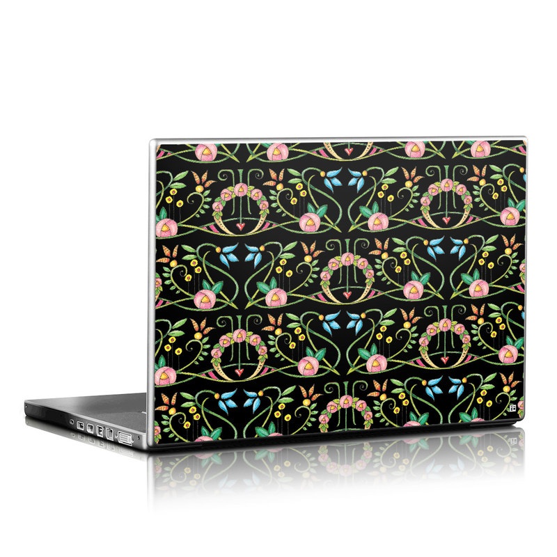 iStyles Universal Fit Laptop Skin design of Flower, Rectangle, Textile, Ornament, Plant, Line, Motif, Creative arts, Art, Pattern, with black, pink, blue, green, yellow colors, and tagged with patterns, flowers, flower, arc, pattern.