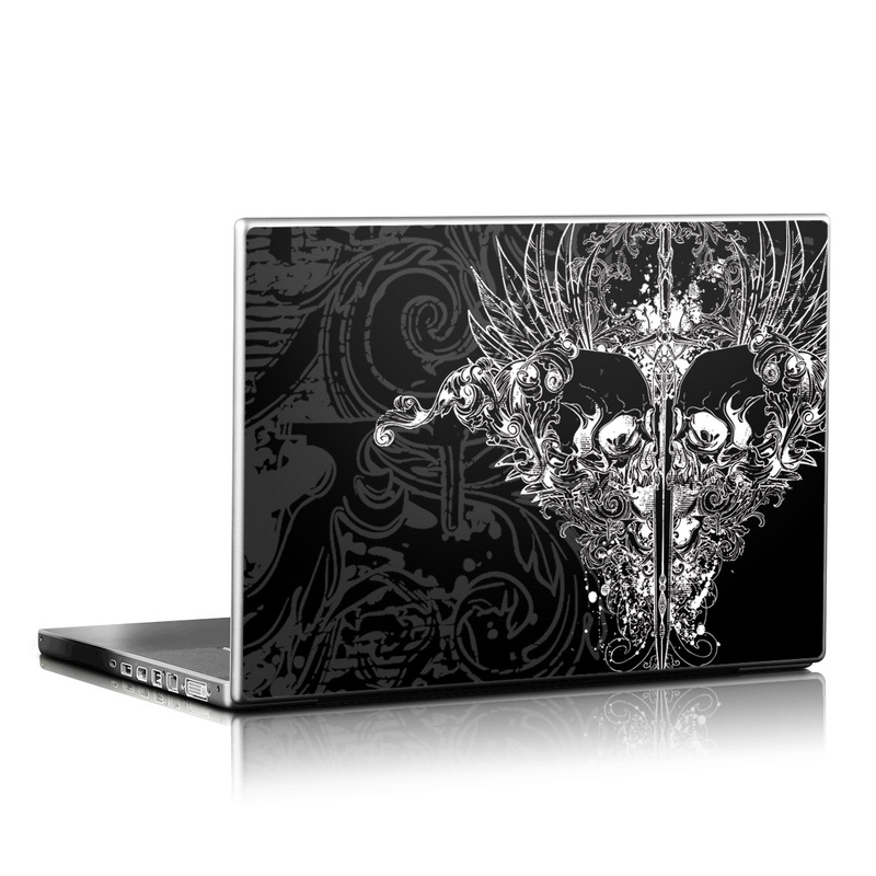 iStyles Universal Fit Laptop Skin design of Illustration, Art, Design, Monochrome, Graphic design, Pattern, Fictional character, Skull, Black-and-white, Graphics, with black, gray colors, and tagged with fantasy, patterns, objects.