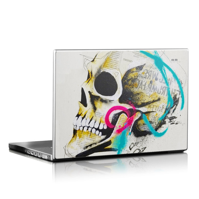 iStyles Universal Fit Laptop Skin design of Graphic design, Skull, Illustration, Art, Bone, Drawing, Visual arts, Font, Modern art, Street art, with blue, pink, yellow, black colors, and tagged with skulls, abstract.