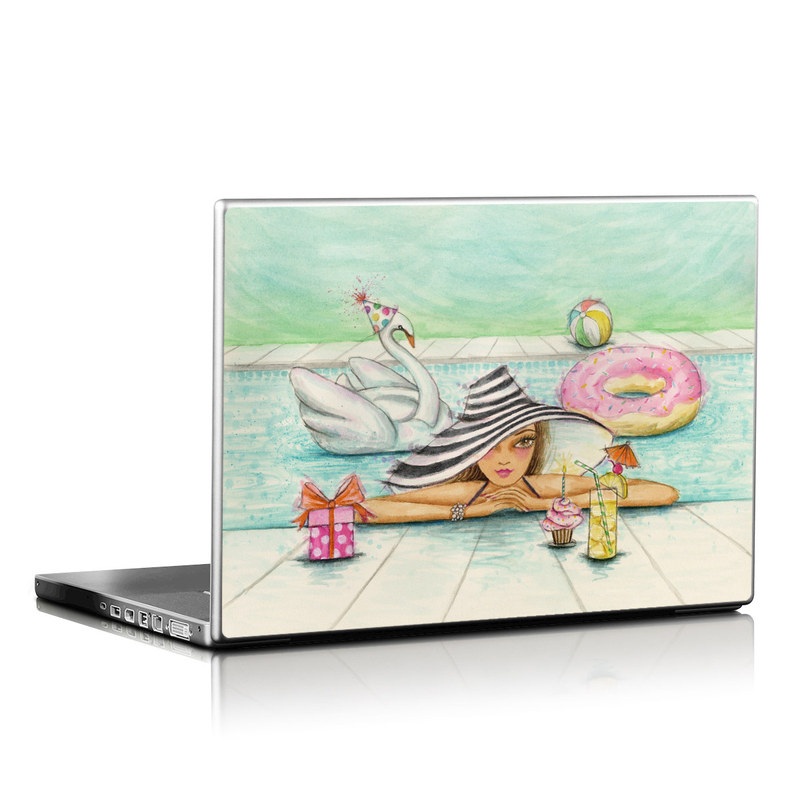 iStyles Universal Fit Laptop Skin design of Watercolor paint, Illustration, Cartoon, Art, Painting, Drawing, Fictional character, with blue, pink, white, black, brown, red, green, yellow colors, and tagged with people, fineart, objects, animals, urban, drawn, face, faces, fashion, handdrawn, painting, portrait, woman, women, donut, present, cocktail, drink, swan, swimming, ball, cupcake.