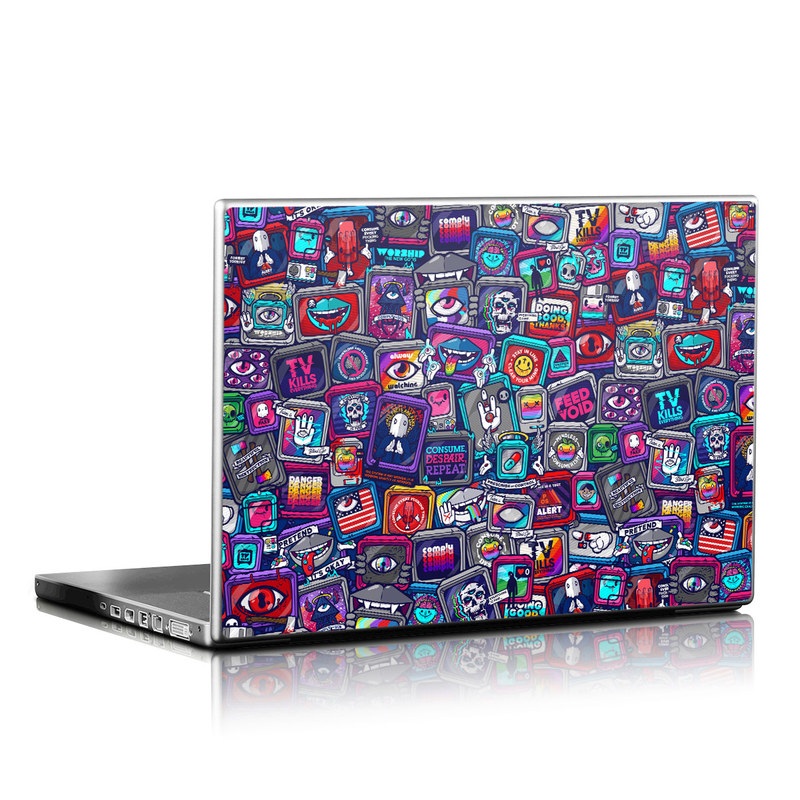 iStyles Universal Fit Laptop Skin design of Pattern, Font, Art, Visual arts, Collection, with red, blue, black, gray, purple, yellow, white, green colors, and tagged with patterns, objects, signs, skulls, illustration, modern, skull, tattoo, thenewgods, tv, vector.