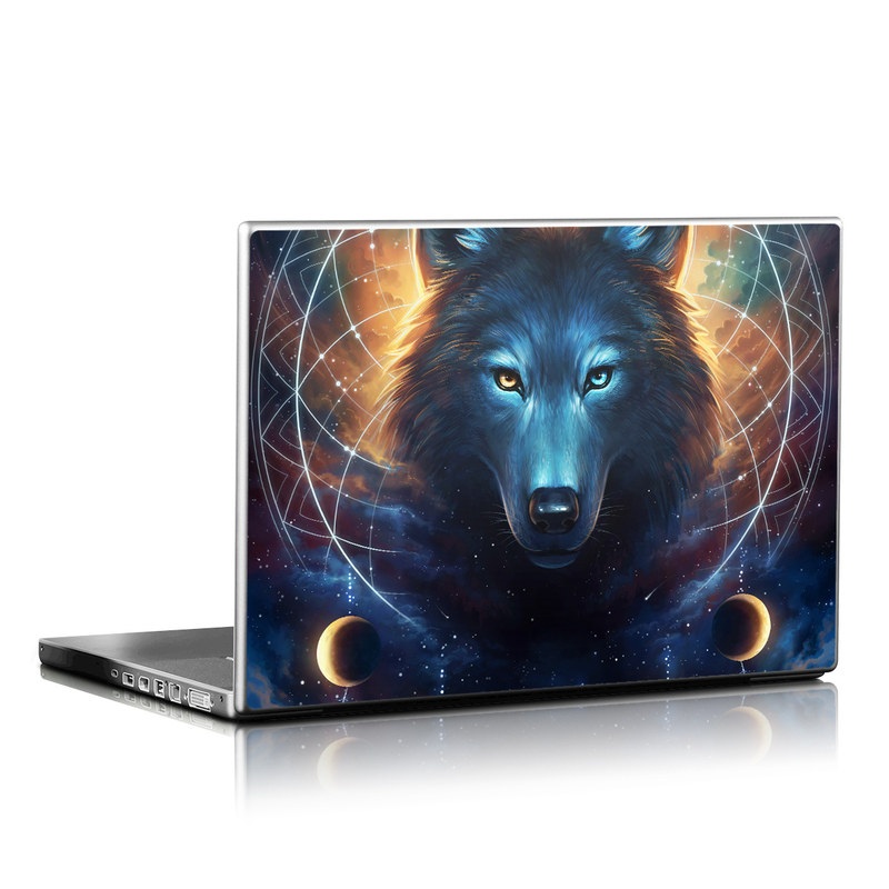 iStyles Universal Fit Laptop Skin design of Light, Nature, Carnivore, Organism, Dog breed, Art, Electric blue, Space, Midnight, Illustration, with black, blue, yellow, orange, green, red, white colors, and tagged with animals, signs, space, fantasy, blue, feathers, moon, sky, wolf, yellow.