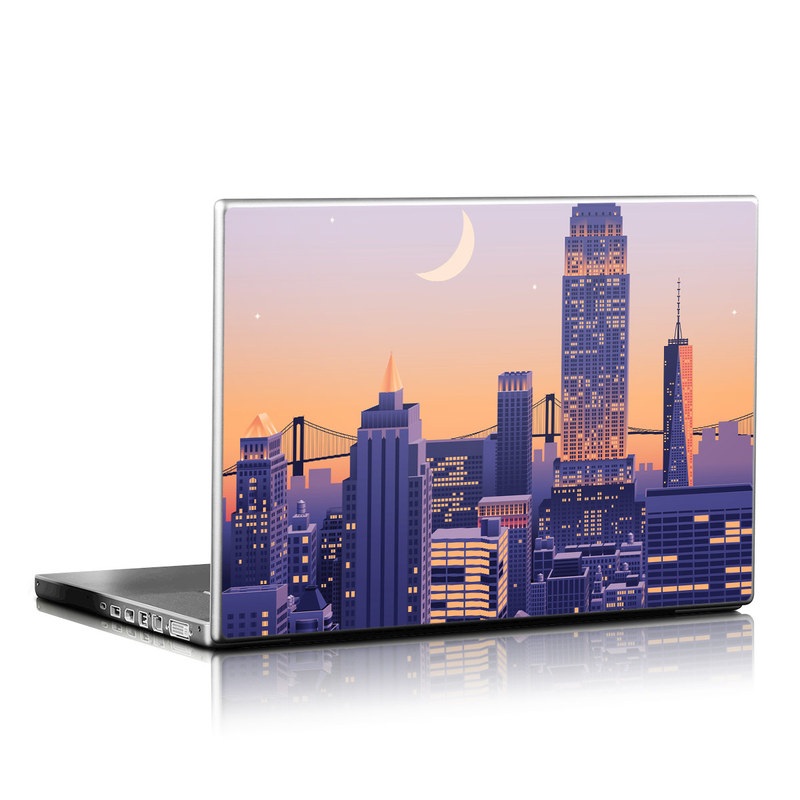 iStyles Universal Fit Laptop Skin design of Skyscraper, Building, Sky, Atmosphere, Moon, World, Nature, Tower, Afterglow, Dusk, with blue, purple, yellow, orange colors, and tagged with urban, space, empire, state, building, new, york, skyline, brooklyn, bridge, moon, stars.